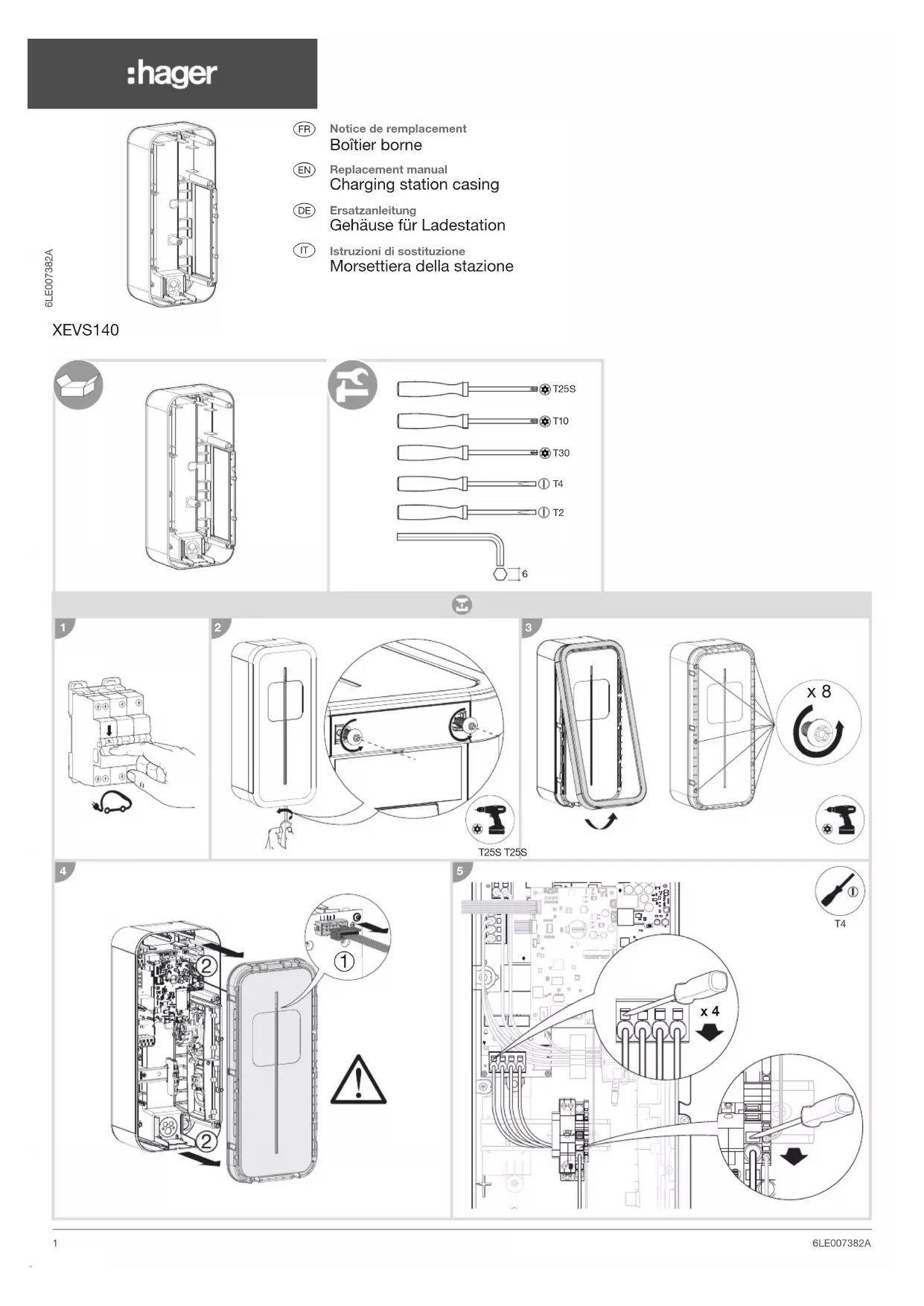 Consignes de sécuritéL’installation et le montage d’appareils électriques doivent être effectués uniquement par un électricien qualifié. Les prescriptions de prévention contre les accidents en vigueur dans le pays doivent être respectées. Le non-respect des consignes d’installation peut entraîner des dommages sur l’appareil, un incendie ou présenter d’autres dangers.Service Assistance TechniquePour obtenir des conseils lors de l’installation, contactez l’assistance technique : RecommandationsTout accès aux zones internes, au-delà des zones décrites dans la présente notice sont à proscrire et annulent la garantie et toute autre forme de prise en charge. En e et, ces manipulations peuvent être dommageables aux parties et/ou aux composants électroniques. Ces produits ont été défi nis afi n de ne pas avoir à y accéder dans le cadre de la mise en œuvre et des opérations de maintenance du produit.Document non contractuel, soumis à modifications sans préavis.Toutes les réponses, ressources et contacts dont vous avez besoin pour installer une borne de charge witty sont disponibles en scannant le Flashcode ou en vous rendant sur https://help.hager.fr/installation-produits/• Veuillez observer les prescriptions et les normes en vigueur pour les circuits électriques TBTS lors de l'installation et de la pose des câbles. Avant toute intervention sur l'appareil ou la charge, mettre l'installation hors tension.• Ne pas oublier de prendre en compte tous les disjoncteurs qui délivrent des tensions potentiellement dangereuses à l'appareil ou à la charge.• Risque de choc électrique.• Le remplacement d'une pièce de rechange doit se faire borne de recharge hors tension.• Avant toute intervention dans une borne de recharge, veuillez vous référer au manuel de maintenance.• Appareil à installer uniquement par un installateur électricien selon les normes d’installation en vigueur dans le pays.• Tenir une carte électronique par les bords pour éviter de toucher les composants sensibles.• Porter un bracelet antistatique lors de la manipulation d’une carte électronique pour prévenir tout dommage. Si vous n’avez pas de bracelet antistatique, toucher un point métallique relié à la terre avant de manipulerla carte afin de vous décharger de votre électricité statique.Toucher régulièrement l’objet métallique pendant toute la manipulation.• Conserver les produits électroniques dans leur emballage protégé contre les décharges électrostatiques ou sur un support antistatique tant que celle-ci n’est pas installée.Hager 03/2021 - 6LE007382A