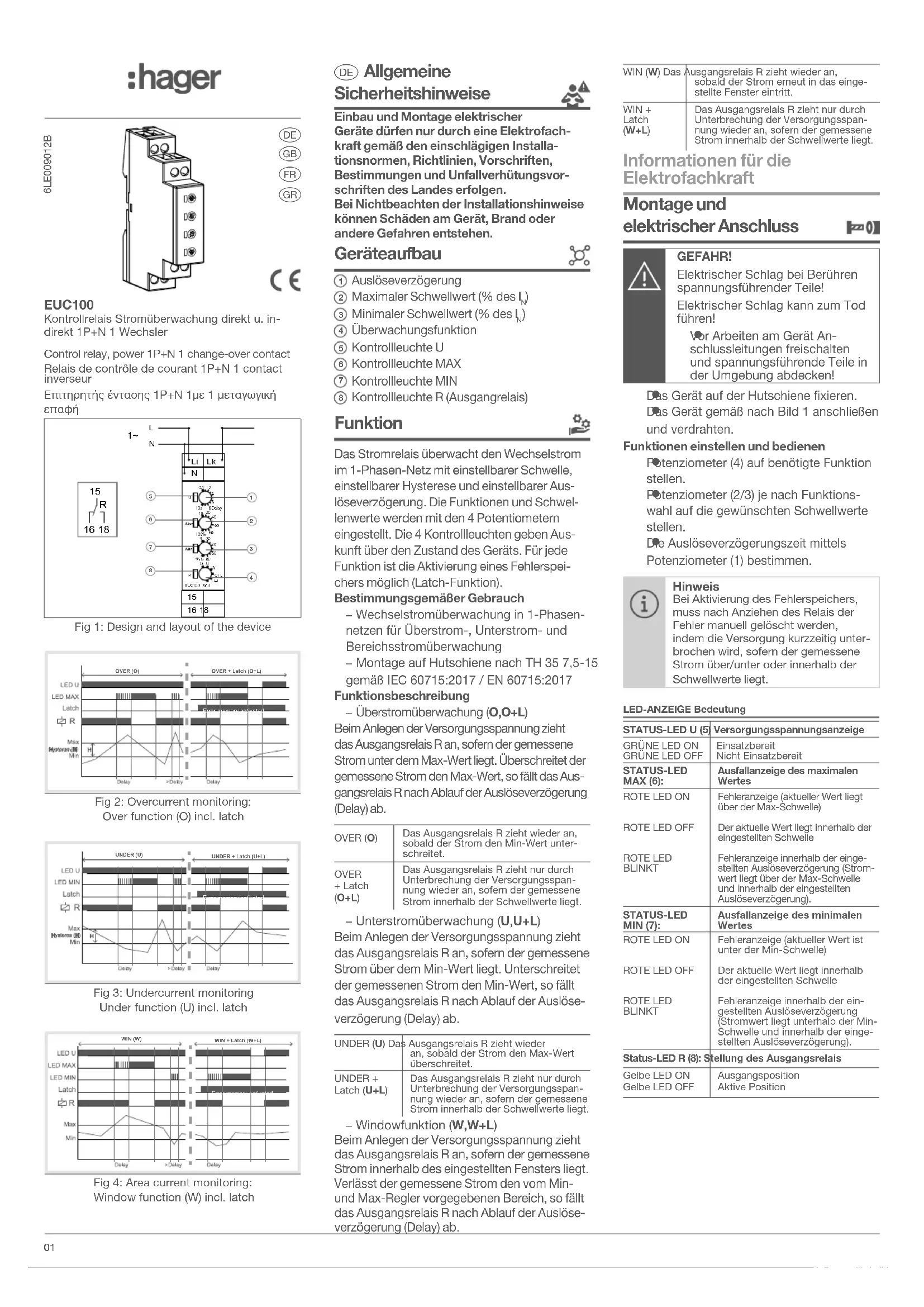 Fig 1: Design and layout of the deviceOVER (O)OVER + Latch (O+L)Hysteres (H)Fig 2: Overcurrent monitoring: Over function (O) incl. latchUNDER (U)UNDER + Latch (U+L)Hysteres (H)Fig 3: Undercurrent monitoring Under function (U) incl. latchWIN (W)WIN + Latch (W+L)Fig 4: Area current monitoring: Window function (W) incl. latchError memory activated Error memory activated Error memory activated02 Hager Electro SAS-BP3-67215 Obernai Cedex, France a Consignes de sécurité générales L’installation et le montage d’appareils élec- triques doivent être eectués uniquement par des électriciens qualifiés, en confor- mité avec les normes d’installation et dans le respect des directives, dispositions et consignes de sécurité et de prévention des accidents en vigueur dans le pays. Le non-respect des consignes d’installation peut entraîner des dommages sur l’appareil, un incendie ou présenter d’autres dangers. Composition de l’appareil