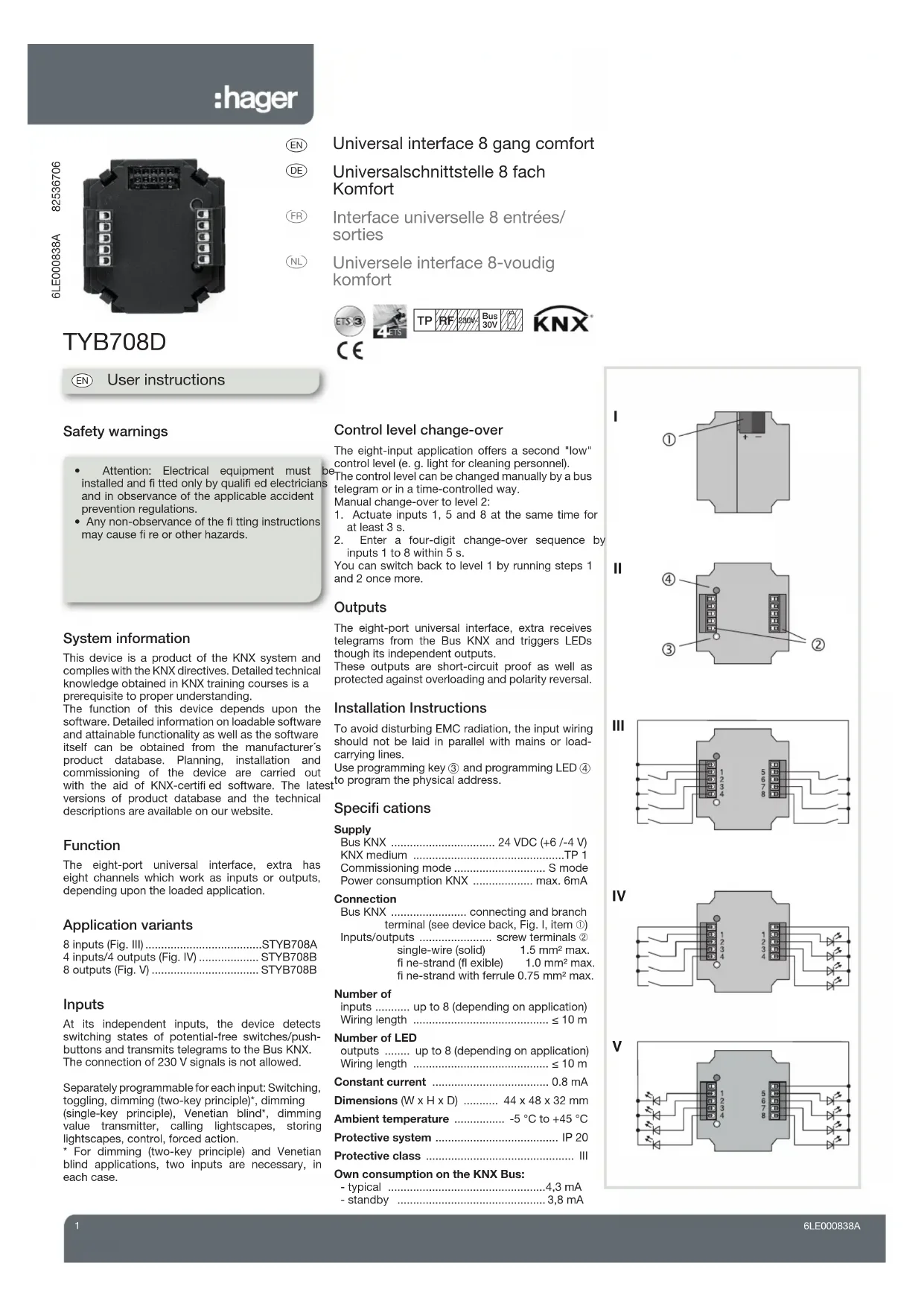 Notice d'instruction Consignes de securitéInformations sur le systèmeCet appareil est un produit du système KNX et est conforme au standard KNX. Des connaissances spécialisées détaillées dispensées par le biais de formations KNX sont nécessaires pour la compréhension du système. La programmation, l’installation et la mise en service de l’appareil s’effectuent à l’aide d’un logiciel certifi é KNX.Les fonctions précises de ces produits dépendent de la confi guration et du paramétrage. Le logiciel d’application est disponible dans la base de données produit. La base de données produit, les descriptions techniques, les programmes de conversion ainsi que d’autres logiciels d’assistance à jour sont disponibles sur notre site internet.FonctionL'interface universelle 8 entrées/sorties est dotée de canaux qui peuvent être confi gurés en entrée ou sortie LED selon l'application ETS utilisée.Variantes d’application8 entrées (fi g III) .................................. STYB708A4 entrées / 4 sorties (fi g. IV) ................ STYB708B8 sorties (Fig. V) .................................. STYB708BEntréesLes modules d’entrées universels permettent d’interfacer des contacts libres de potentiels avec le bus KNX. Par exemple, des boutons poussoirs, interrupteurs ou automatismes conventionnels peuvent ainsi être rendus communicants.La connexion de signaux 230 V n'est pas permise.Pour chaque entrée, les fonctions suivantes peuvent être sélectionnées : ON/OFF, télérupteur, variation 2 boutons, variation 1 bouton, volet roulant 2 boutons, niveau de luminosité, scène, forçage.La réalisation des fonctions variation 2 boutons ou volet roulant 2 boutons nécessitent l'utilisation de 2 entrées séparées.• L’installation et le montage d’appareils électriques doivent être effectués uniquement par des électriciens qualifi és, en conformité avec les normes d’installation et dans le respect des directives, dispositions et consignes de sécurité et de prévention des accidents en vigueur dans le pays.• Le non-respect des consignes d’installation peut entraîner des dommages sur l’appareil, un incendie ou présenter d’autres dangers.