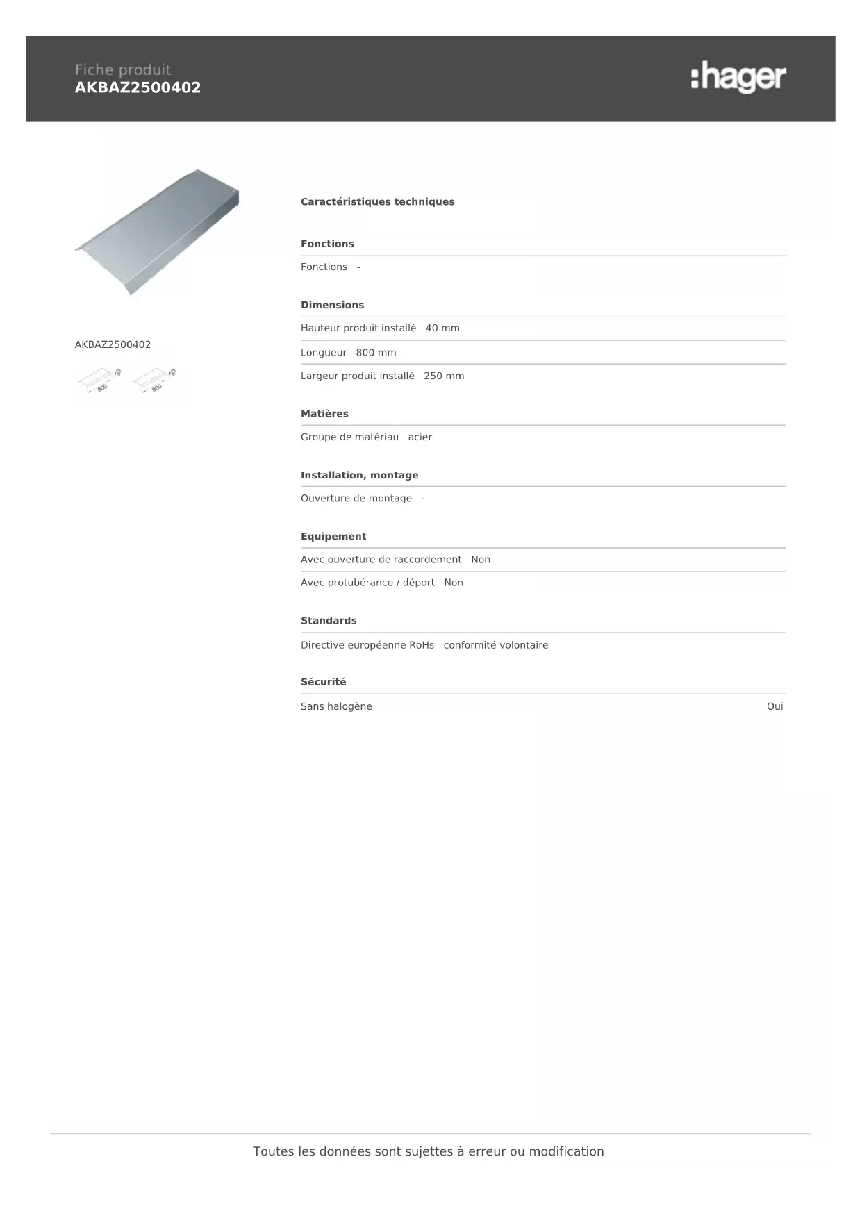 AKBAZ2500402 AKBAZ2500402 Caractéristiques techniques Fonctions Fonctions - Dimensions Hauteur produit installé 40 mm Longueur 800 mm Largeur produit installé 250 mm Matières Groupe de matériau acier Installation, montage Ouverture de montage - Equipement Avec ouverture de raccordement Non Avec protubérance / déport Non Standards Directive européenne RoHs conformité volontaire Sécurité Sans halogène Oui Toutes les données sont sujettes à erreur ou modification