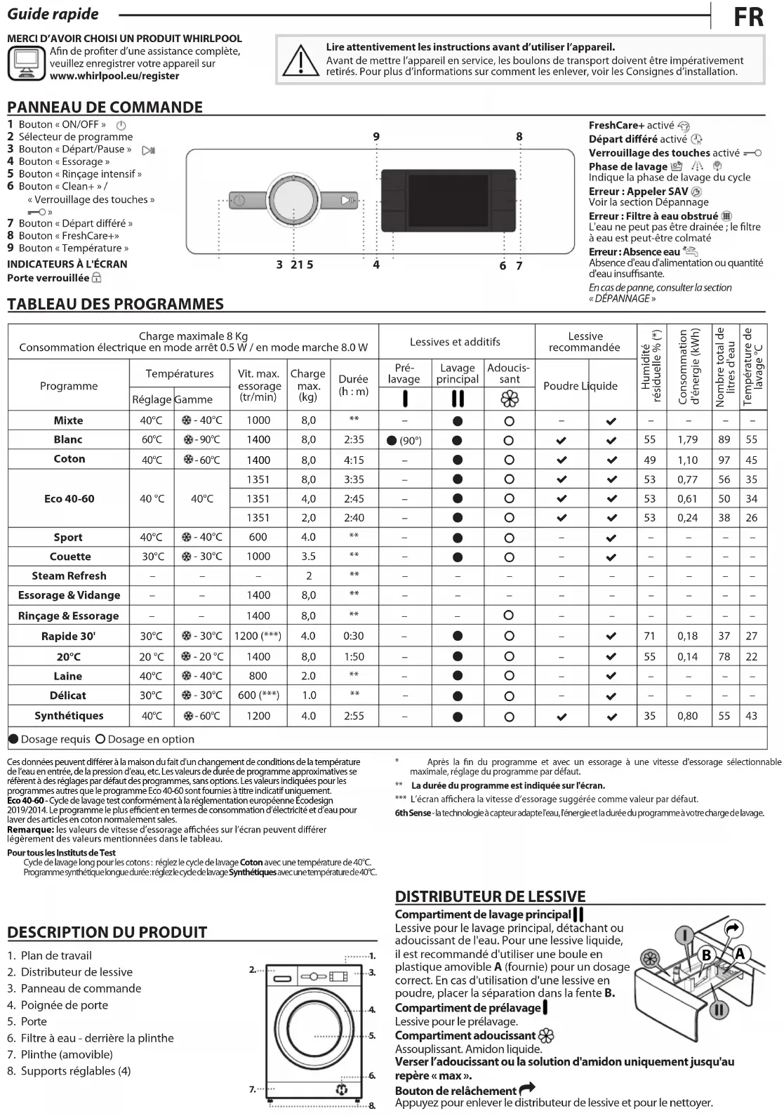 Guide rapide MERCI D’AVOIR CHOISI UN PRODUIT WHIRLPOOLAn de proter d’une assistance complète, veuillez enregistrer votre appareil sur www . whirlpool . eu/ registerLire attentivement les instructions avant d’utiliser l’appareil.Avant de mettre l’appareil en service, les boulons de transport doivent être impérativement retirés. Pour plus d’informations sur comment les enlever, voir les Consignes d’installation.