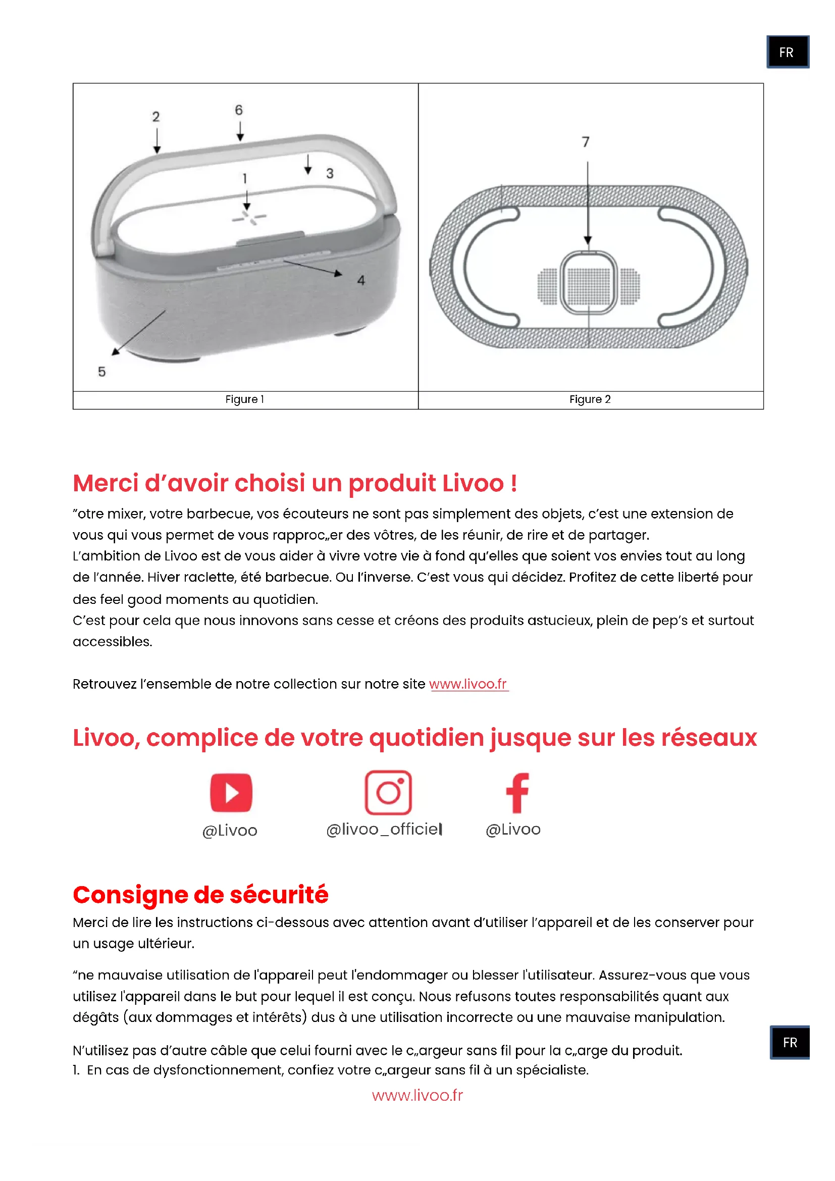 Merci d’avoir choisi un produit Livoo ! Votre mixer, votre barbecue, vos écouteurs ne sont pas simplement des objets, c’est une extension de vous qui vous permet de vous rapprocher des vôtres, de les réunir, de rire et de partager. L’ambition de Livoo est de vous aider à vivre votre vie à fond qu’elles que soient vos envies tout au long de l’année. Hiver raclette, été barbecue. Ou l’inverse. C’est vous qui décidez. Profitez de cette liberté pour des feel good moments au quotidien. C’est pour cela que nous innovons sans cesse et créons des produits astucieux, plein de pep’s et surtout accessibles. Retrouvez l’ensemble de notre collection sur notre site www.livoo.fr Livoo, complice de votre quotidien jusque sur les réseaux