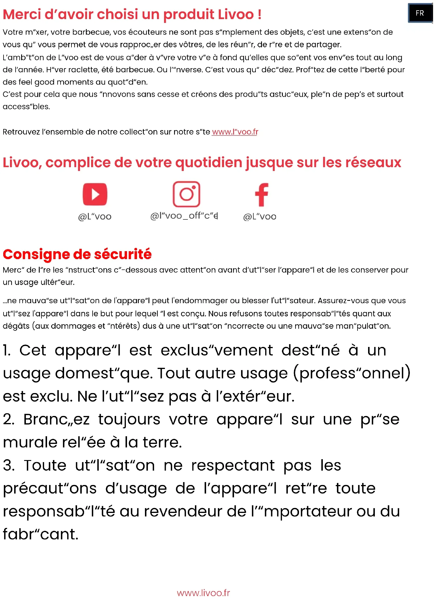 Figure 4www.livoo.fr Merci d’avoir choisi un produit Livoo ! Votre mixer, votre barbecue, vos écouteurs ne sont pas simplement des objets, c’est une extension de vous qui vous permet de vous rapprocher des vôtres, de les réunir, de rire et de partager. L’ambition de Livoo est de vous aider à vivre votre vie à fond qu’elles que soient vos envies tout au long de l’année. Hiver raclette, été barbecue. Ou l’inverse. C’est vous qui décidez. Profitez de cette liberté pour des feel good moments au quotidien. C’est pour cela que nous innovons sans cesse et créons des produits astucieux, plein de pep’s et surtout accessibles. Retrouvez l’ensemble de notre collection sur notre site www.livoo.fr Livoo, complice de votre quotidien jusque sur les réseaux