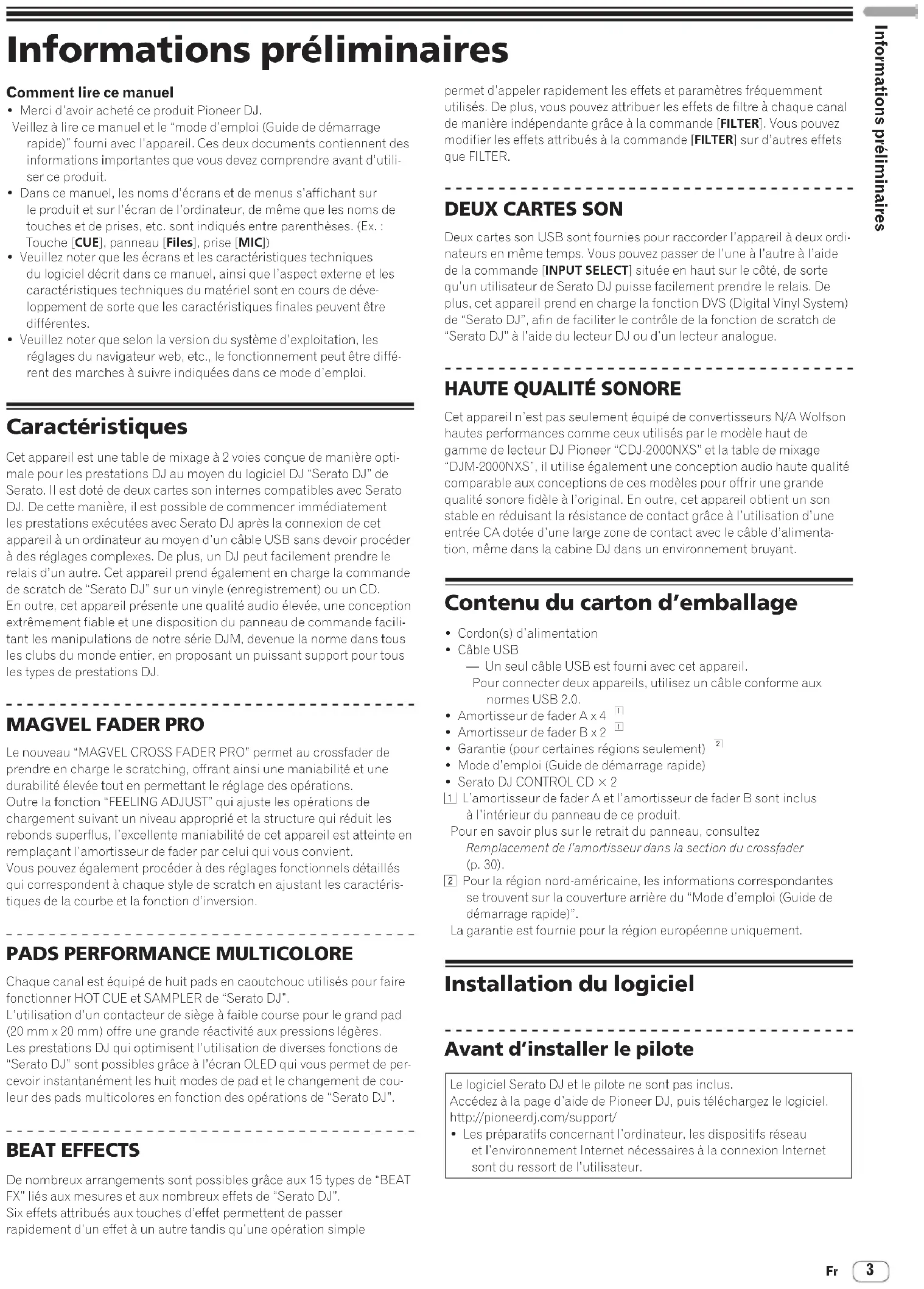 Informations préliminaires Informations préliminaires Comment lire ce manuel ! Merci d’avoir acheté ce produit Pioneer DJ. Veillez à lire ce manuel et le “mode d’emploi (Guide de démarrage rapide)” fourni avec l’appareil. Ces deux documents contiennent des informations importantes que vous devez comprendre avant d’utili-ser ce produit.! Dans ce manuel, les noms d’écrans et de menus s’affichant sur le produit et sur l’écran de l’ordinateur, de même que les noms de touches et de prises, etc. sont indiqués entre parenthèses. (Ex. : Touche [CUE], panneau [Files], prise [MIC]) ! Veuillez noter que les écrans et les caractéristiques techniques du logiciel décrit dans ce manuel, ainsi que l’aspect externe et les caractéristiques techniques du matériel sont en cours de déve-loppement de sorte que les caractéristiques finales peuvent être différentes.! Veuillez noter que selon la version du système d’exploitation, les réglages du navigateur web, etc., le fonctionnement peut être diffé-rent des marches à suivre indiquées dans ce mode d’emploi. Caractéristiques Cet appareil est une table de mixage à 2 voies conçue de manière opti-male pour les prestations DJ au moyen du logiciel DJ “Serato DJ” de Serato. Il est doté de deux cartes son internes compatibles avec Serato DJ. De cette manière, il est possible de commencer immédiatement les prestations exécutées avec Serato DJ après la connexion de cet appareil à un ordinateur au moyen d’un câble USB sans devoir procéder à des réglages complexes. De plus, un DJ peut facilement prendre le relais d’un autre. Cet appareil prend également en charge la commande de scratch de “Serato DJ” sur un vinyle (enregistrement) ou un CD.En outre, cet appareil présente une qualité audio élevée, une conception extrêmement fiable et une disposition du panneau de commande facili-tant les manipulations de notre série DJM, devenue la norme dans tous les clubs du monde entier, en proposant un puissant support pour tous les types de prestations DJ.