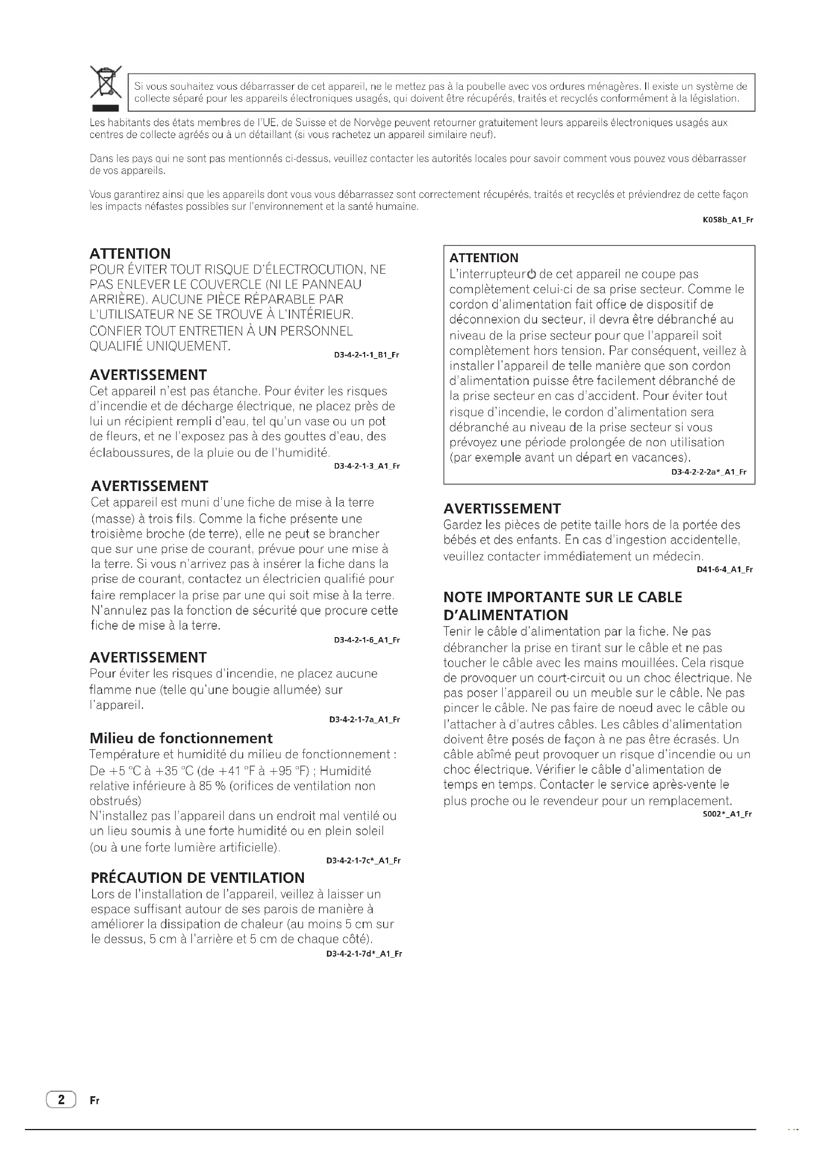 Lors de l’installation de l’appareil, veillez à laisser un espace suffisant autour de ses parois de manière à améliorer la dissipation de chaleur (au moins 5 cm sur le dessus, 5 cm à l’arrière et 5 cm de chaque côté). D3-4-2-1-7d*_A1_Fr ATTENTION L’interrupteur de cet appareil ne coupe pas complètement celui-ci de sa prise secteur. Comme le cordon d’alimentation fait office de dispositif de déconnexion du secteur, il devra être débranché au niveau de la prise secteur pour que l’appareil soit complètement hors tension. Par conséquent, veillez à installer l’appareil de telle manière que son cordon d’alimentation puisse être facilement débranché de la prise secteur en cas d’accident. Pour éviter tout risque d’incendie, le cordon d’alimentation sera débranché au niveau de la prise secteur si vous prévoyez une période prolongée de non utilisation (par exemple avant un départ en vacances). D3-4-2-2-2a*_A1_Fr AVERTISSEMENT Gardez les pièces de petite taille hors de la portée des bébés et des enfants. En cas d’ingestion accidentelle, veuillez contacter immédiatement un médecin. D41-6-4_A1_Fr Si vous souhaitez vous débarrasser de cet appareil, ne le mettez pas à la poubelle avec vos ordures ménagères. Il existe un système de collecte séparé pour les appareils électroniques usagés, qui doivent être récupérés, traités et recyclés conformément à la législation. Les habitants des états membres de l’UE, de Suisse et de Norvège peuvent retourner gratuitement leurs appareils électroniques usagés aux centres de collecte agréés ou à un détaillant (si vous rachetez un appareil similaire neuf). Dans les pays qui ne sont pas mentionnés ci-dessus, veuillez contacter les autorités locales pour savoir comment vous pouvez vous débarrasser de vos appareils. Vous garantirez ainsi que les appareils dont vous vous débarrassez sont correctement récupérés, traités et recyclés et préviendrez de cette façon les impacts néfastes possibles sur l’environnement et la santé humaine. K058b_A1_Fr