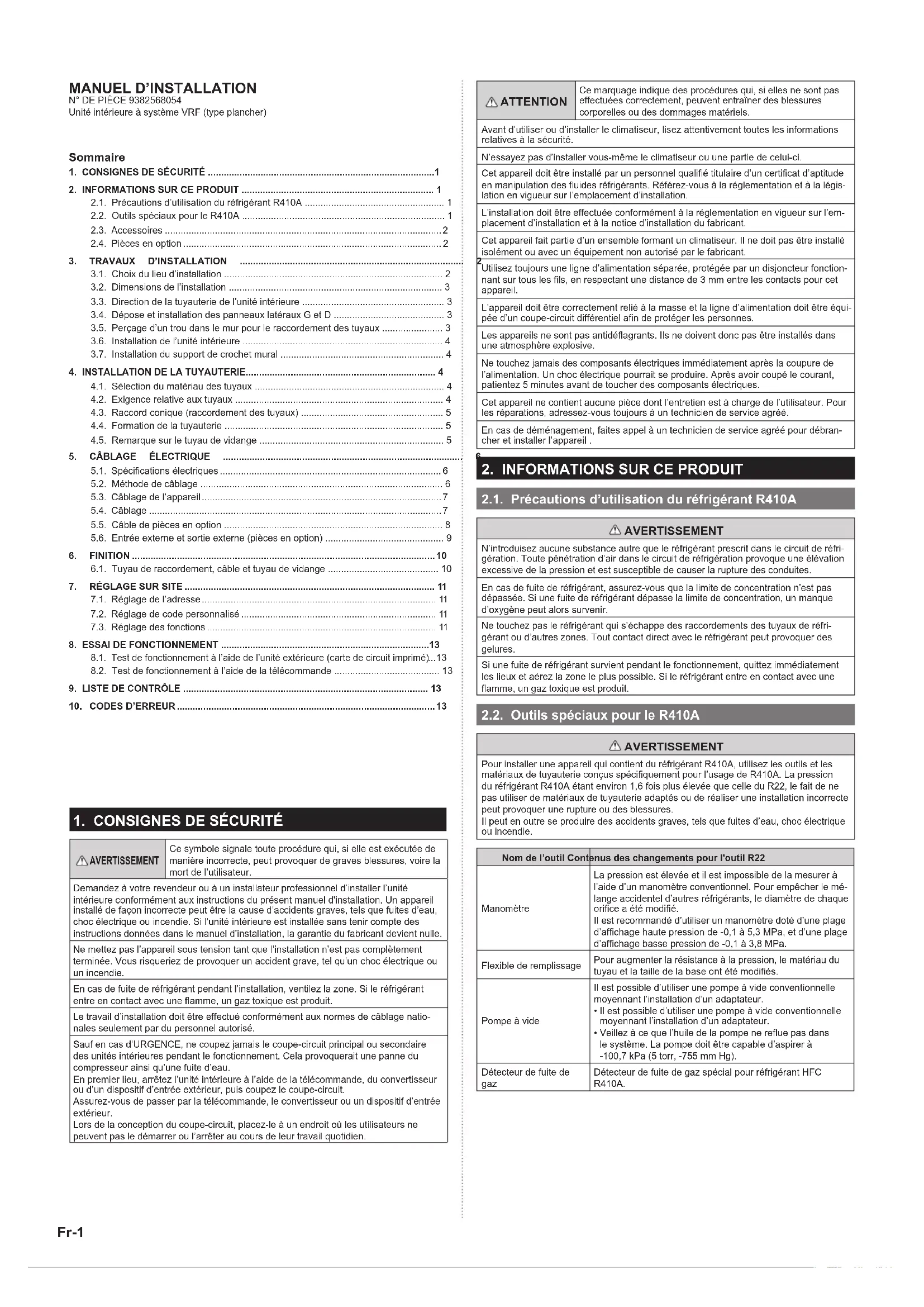 Unité intérieure à système VRF (type plancher) Sommaire