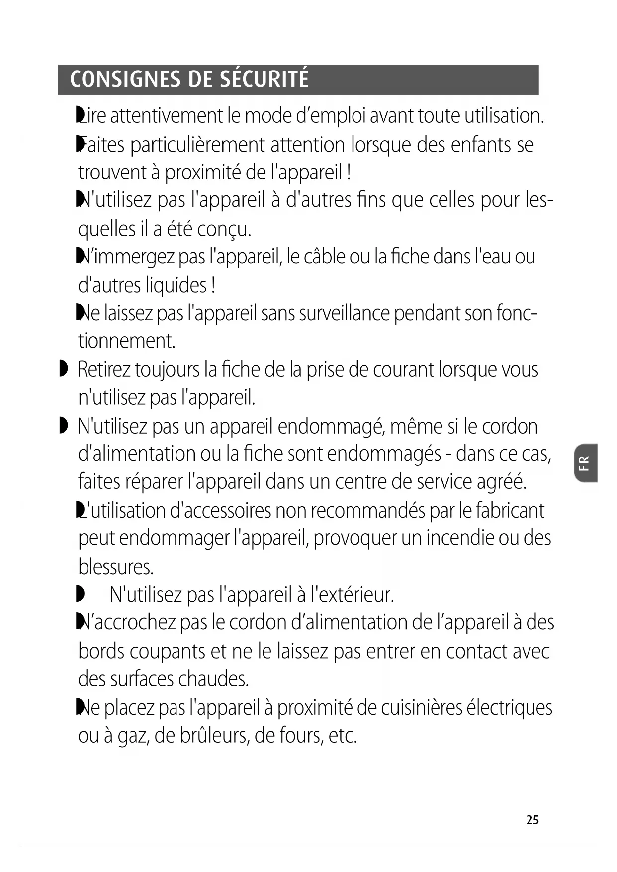 Ne laissez pas l'appareil sans surveillance pendant son fonc- tionnement. Retirez toujours la fiche de la prise de courant lorsque vous n'utilisez pas l'appareil. N'utilisez pas un appareil endommagé, même si le cordon d'alimentation ou la fiche sont endommagés - dans ce cas, faites réparer l'appareil dans un centre de service agréé.