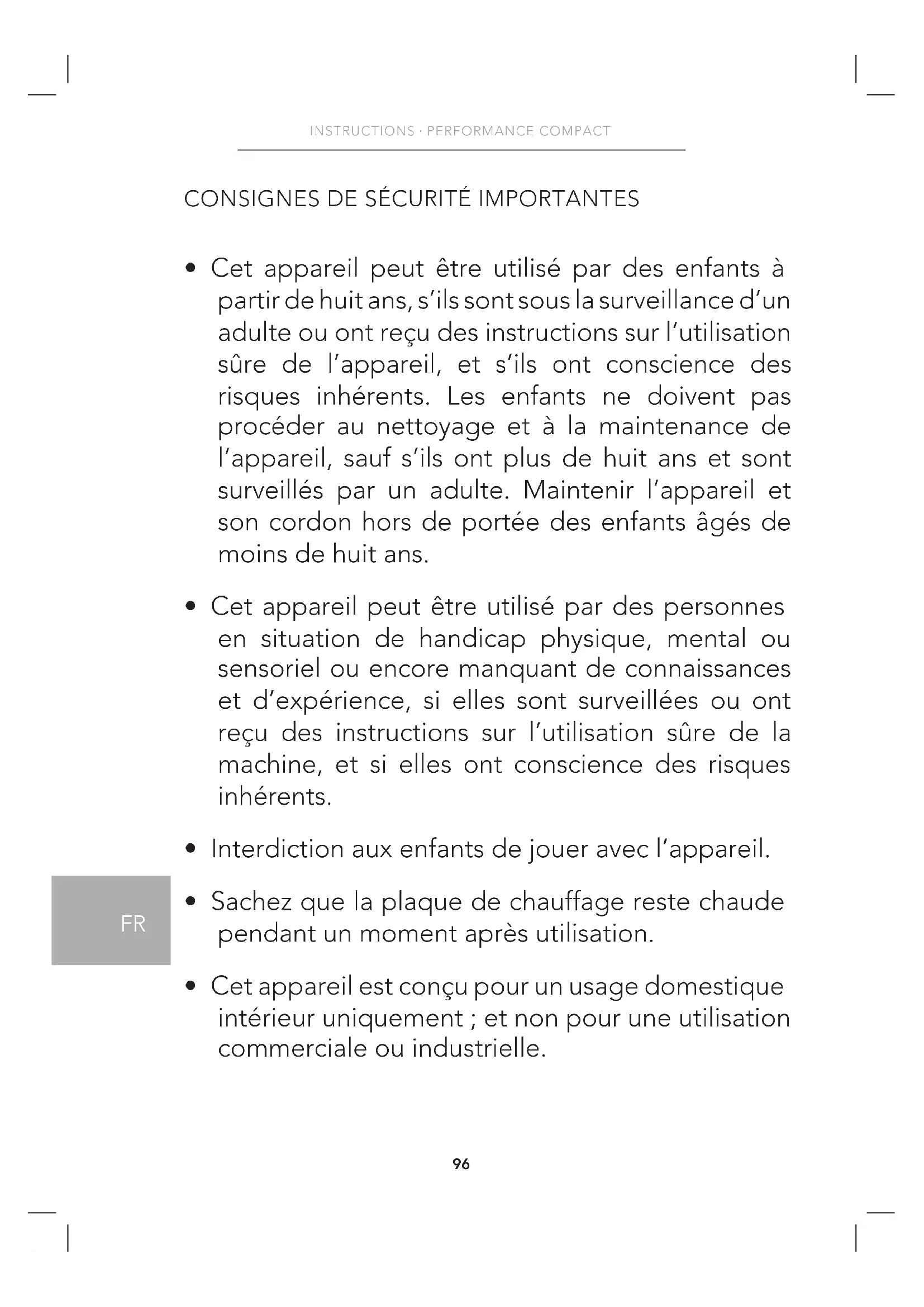 - Cet appareil peut être utilisé par des enfants à partir de huit ans, s’ils sont sous la surveillance d’un adulte ou ont reçu des instructions sur l’utilisation sûre de l’appareil, et s’ils ont conscience des risques inhérents. Les enfants ne doivent pas procéder au nettoyage et à la maintenance de l’appareil, sauf s’ils ont plus de huit ans et sont surveillés par un adulte. Maintenir l’appareil et son cordon hors de portée des enfants âgés de moins de huit ans.