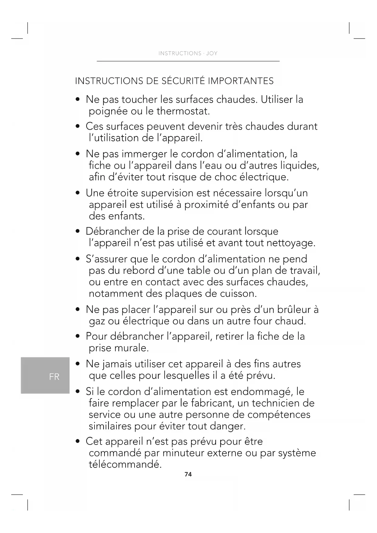 - N’utiliser aucun objet coupant ou pointu ni aucun agent de nettoyage abrasif à des fins de nettoyage.78 INSTRUCTIONS · JOY