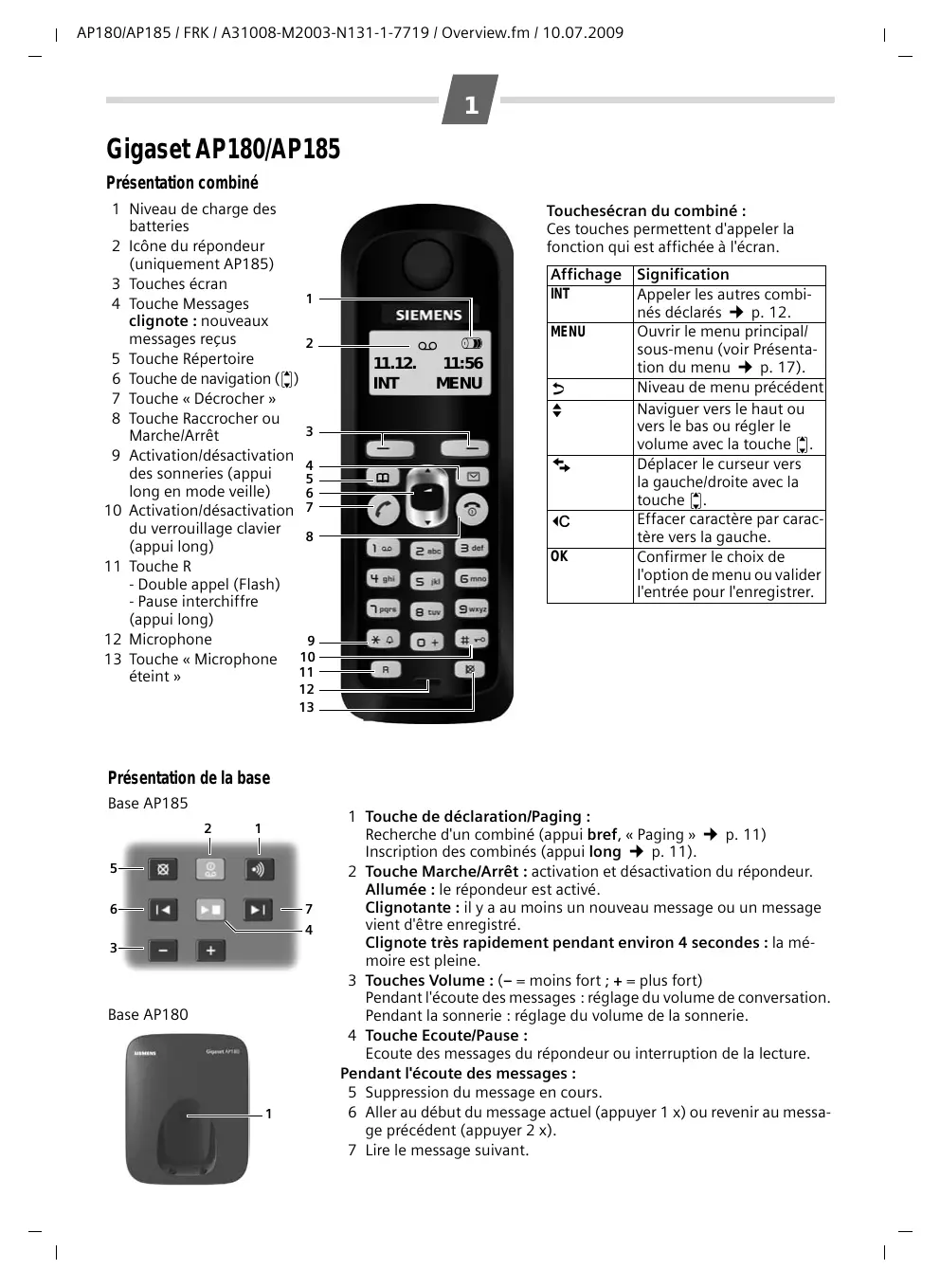 Attribution de la touche 1 au répondeur/à la messagerie externe Pour accéder directement au répondeur/à la messagerie externe, il vous suffit de maintenir enfoncée la touche 1 du combiné. AP180/AP185 / FRK / A31008-M2003-N131-1-7719 / main.fm / 10.07.2009
