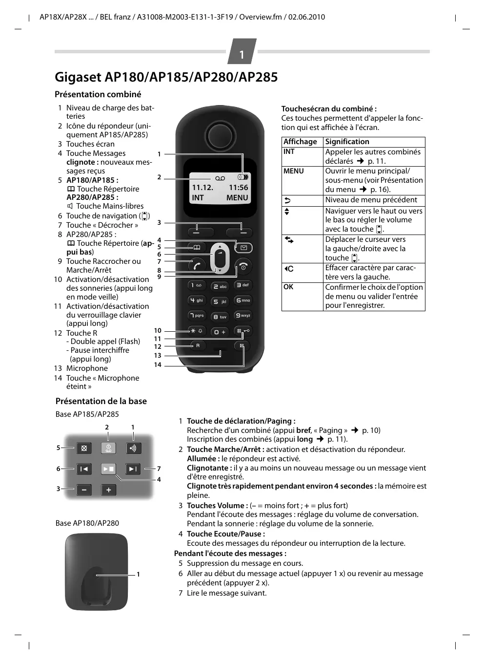 1 Touche de déclaration/Paging : Recherche d'un combiné (appui bref, « Paging » p. 10) Inscription des combinés (appui long p. 11). 2 Touche Marche/Arrêt : activation et désactivation du répondeur. Allumée : le répondeur est activé. Clignotante : il y a au moins un nouveau message ou un message vient d'être enregistré. Clignote très rapidement pendant environ 4 secondes : la mémoire est pleine. 3 Touches Volume : (– = moins fort ; + = plus fort) Pendant l'écoute des messages : réglage du volume de conversation. Pendant la sonnerie : réglage du volume de la sonnerie. 4 Touche Ecoute/Pause : Ecoute des messages du répondeur ou interruption de la lecture. Pendant l'écoute des messages : 5 Suppression du message en cours. 6 Aller au début du message actuel (appuyer 1 x) ou revenir au message précédent (appuyer 2 x). 7 Lire le message suivant. AP18X/AP28X ... / BEL franz / A31008-M2003-E131-1-3F19 / Overview.fm / 02.06.2010