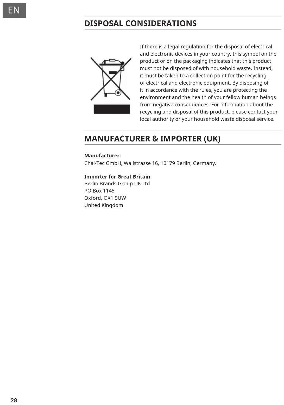 Si l'élimination des appareils électriques et électroniques est réglementée dans votre pays, ce symbole sur le produit ou sur l'emballage indique qu'il ne doit pas être mis au rebut avec les ordures ménagères. Vous devez l'acheminer vers un point de collecte pour le recyclage des appareils électriques et électroniques. En respectant des règles de recyclage, vous protégez l'environnement et la santé de vos semblables des conséquences négatives. Pour plus d'informations sur le recyclage et la mise au rebut de ce produit, contactez votre autorité locale ou votre service d'élimination des déchets ménagers. FABRICANT ET IMPORTATEUR (GB) Fabricant : Chal-Tec GmbH, Wallstraße 16, 10179 Berlin, Allemagne. Importateur pour la Grande-Bretagne : Berlin Brands Group UK Ltd PO Box 1145 Oxford, OX1 9UW United Kingdom41