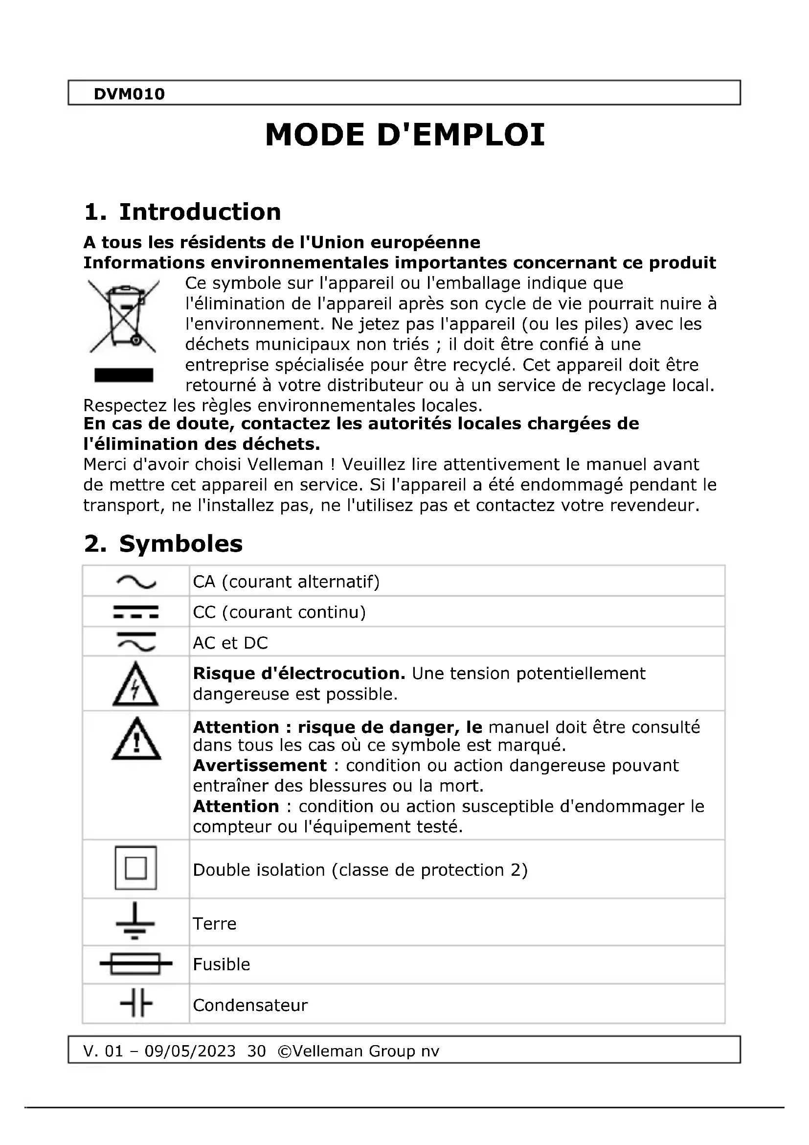 Téléchargez la notice de votre Multimètre au format PDF gratuitement ! Retrouvez votre notice DVM010 - VELLEMAN et reprennez votre appareil électronique en main. Sur cette page sont publiés tous les documents nécessaires à l'utilisation de votre appareil DVM010 de la marque VELLEMAN.