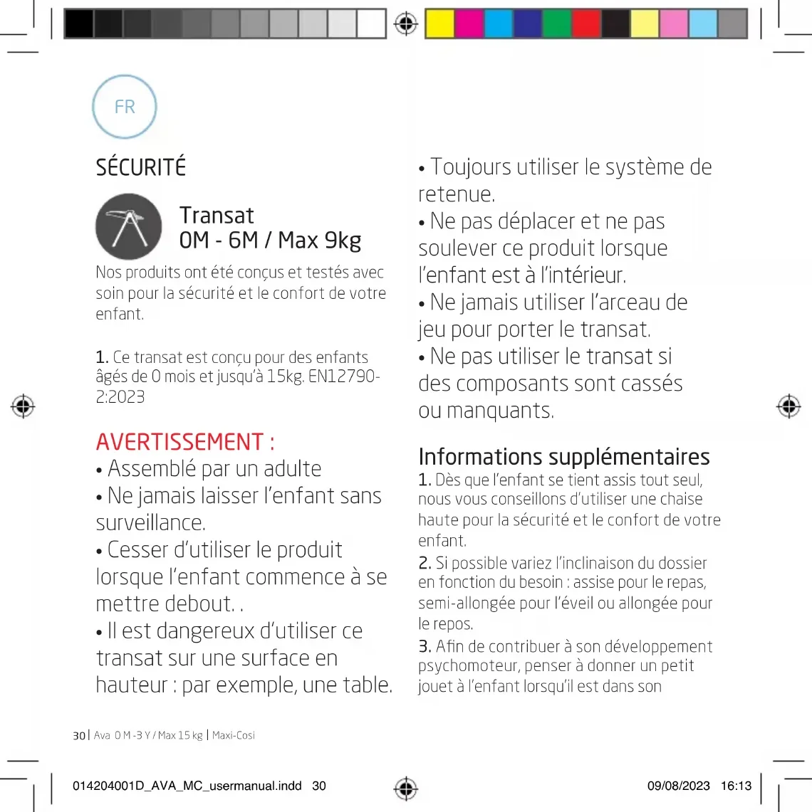 Environnement Lorsque vous n’utilisez plus le produit, nous vous prions par souci de l’environnement de vous débarrasser du produit en faisant le tri des déchets et conformément à la législation locale en la matière. Questions Veuillez prendre contact avec votre distributeur local. Veillez à avoir les informations suivantes sous la main : - Numéro de série - L’âge (la taille) et le poids de votre enfant. Garantie Notre garantie de 24 mois reflète notre confiance dans la qualité supérieure de notre conception, ingénierie, production et la performance du produit. Nous garantissons que ce produit a été fabriqué conformément aux exigences de sécurité et normes de qualité actuelles européennes applicables à ce produit, et que ce produit est, au moment de l’achat, exempt de défaut de matériaux et de fabrication. Dans les conditions mentionnées dans ce document, cette garantie peut être invoquée par les consommateurs dans les pays où ce produit a été vendu par une filiale du groupe Dorel ou par un revendeur ou détaillant autorisé. Notre garantie de 24 mois couvre tous les défauts de matériaux et de fabrication pour une utilisation dans des conditions normales et conformément à la notice pour une période de 24 mois à compter de la date de l’achat initial par le premier client utilisateur. Pour demander des réparations ou des pièces de rechange sous garantie pour des défauts de matériaux et de fabrication, vous devez présenter la preuve d’un achat eectué dans les 24 mois précédant la demande de service. Notre garantie de 24 mois ne couvre pas les dommages causés par l’usure normale, les accidents, l’utilisation abusive, la négligence, le feu, le contact avec un liquide ou toute autre cause extérieure, les dommages résultant d’une utilisation non conforme au mode d’emploi, de l’utilisation avec un autre produit, d’une réparation ou d’un entretien mené par une personne non autorisée par nos services, les produits volés, ne portant plus l’étiquette ou le numéro d’identification ou les produits dont ce numéro a été modifié. Des exemples d’usure normale comprennent : des roues et des tissus usés par l’utilisation régulière et la décoloration et la décomposition 014204001D_AVA_MC_usermanual.indd 33014204001D_AVA_MC_usermanual.indd 33 09/08/2023 16:1309/08/2023 16:1334
