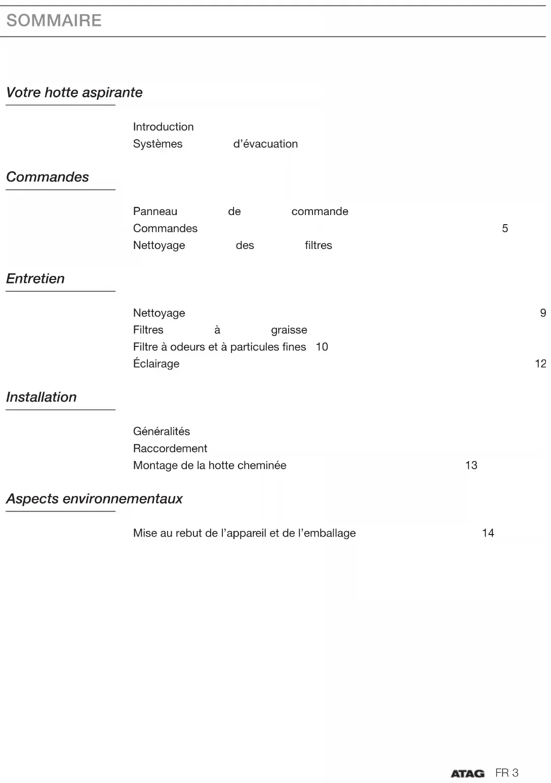 - polystyrène exempt de CFC (mousse PS rigide). Éliminez ces matériaux de manière responsable et conformément aux réglementations locales en vigueur. Cet appareil porte le symbole d’une poubelle barrée d’une croix afin d’attirer votre attention sur le tri sélectif et la nécessité d’éliminer les appareils ménagers domestiques séparément des ordures ménagères. Cela signifie que l’appareil ne peut pas être mis au rebut avec les déchets ménagers non sujets au tri sélectif à la fin de son cycle de vie. Cet appareil doit être déposé dans un centre municipal spécial de collecte et de tri des déchets, ou chez un revendeur assurant ce service. La collecte et la mise au rebut séparées des appareils ménagers évitent les conséquences néfastes pour la santé et l’environnement. Cela permet de récupérer et de recycler les matériaux constitutifs de l’appareil afin de réaliser des économies substantielles d’énergie et de matières brutes. Déclaration de conformité Nous déclarons par la présente que nos produits satisfont aux directives, réglementations et exigences européennes en vigueur ainsi qu’aux exigences mentionnées dans les normes auxquelles il est fait référence.DE 3 INHALT Ihre Dunstabzugshaube Einführung 4 Abluftsysteme 4 Bedienung Bedienfeld 5 Bedienung 5 Reinigung der Filter 7 Wartung Reinigung 9 Fettfilter 10 Geruchs-/Feinstaubfilter 10 Beleuchtung 12 Installation Allgemeines 12 Anschluss 13 Montage der Haube 13 Umweltschutz Entsorgung von Gerät und Verpackung 14DE 4 Einführung Herzlichen Glückwunsch zum Kauf Ihrer Atag Dunstabzugshaube. Bei der Entwicklung dieses Produkts stand optimale Benutzerfreundlichkeit im Mittelpunkt. In dieser Anleitung erfahren Sie, wie Sie das Gerät optimal verwenden. Sie enthält Informationen zur Bedienung sowie Hintergrundinformationen zur Funktionsweise. Lesen Sie vor der Inbetriebnahme des Geräts die Sicherheitshinweise. Lesen Sie diese Bedienungsanleitung vor der ersten Inbetriebnahme des Geräts sorgfältig durch und heben Sie diese zum späteren Nachlesen gut auf. Die neueste Version der Bedienungsanleitung finden Sie auf unserer Website. Abluftsysteme Es gibt zwei verschiedene Methoden für den Anschluss der Dunstabzugshaube: