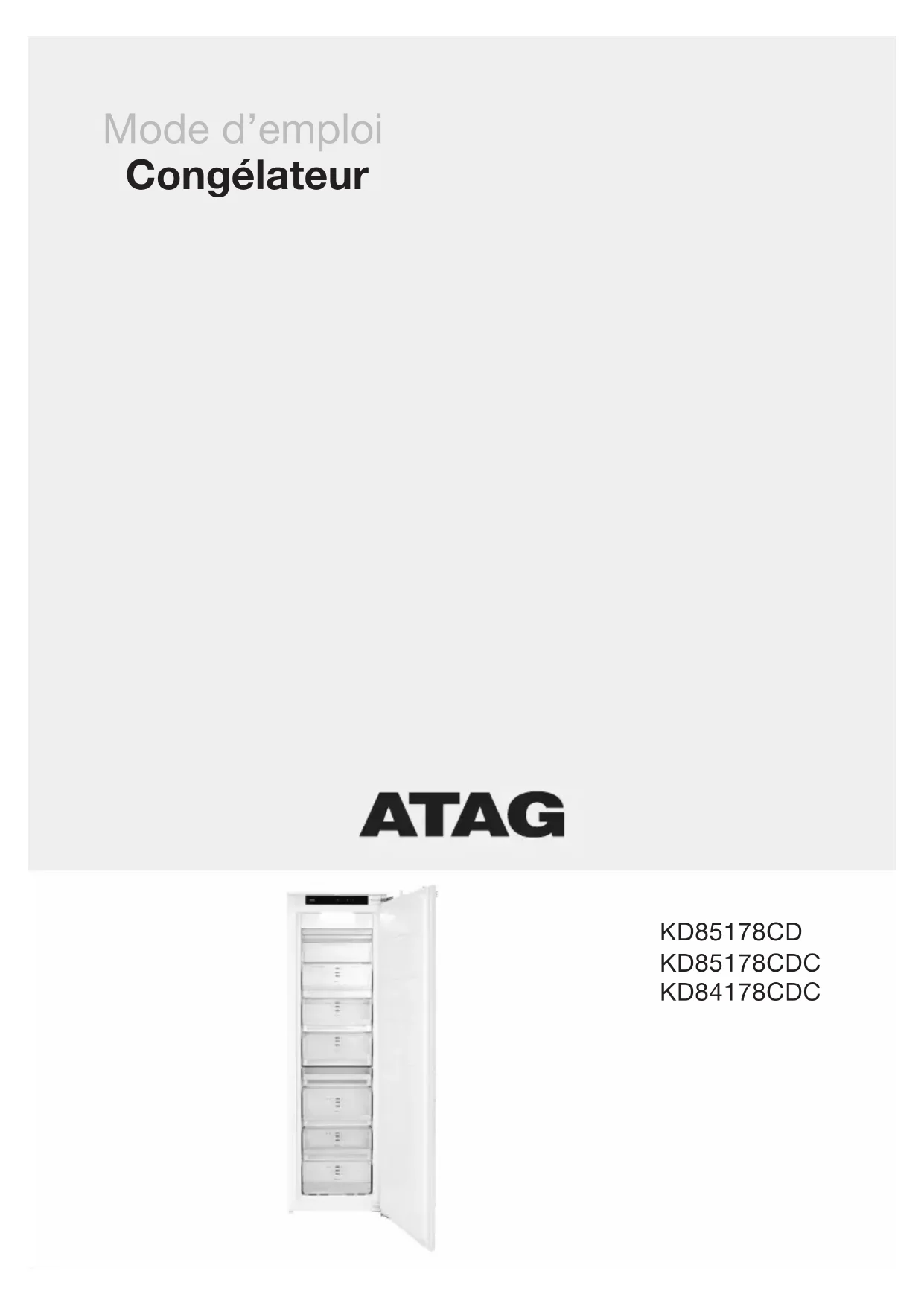 *613825* De gebruiksaanwijzing is ook te vinden op onze website: www.atag.nl www.atag.beMode d’emploi Congélateur KD85178CD KD85178CDC KD84178CDCFR 2 SOMMAIRE Votre congélateur Introduction 4 Consignes de sécurité Sécurité des enfants et personnes vulnérables 5 Sécurité d’ordre général 6 Installation 7 Branchement électrique 8 Utilisation 9 Entretien et nettoyage 9 Mise au rebut 10 Installation et raccordement Choix de l’emplacement 11 Branchement de l’appareil 12 Changement du sens d’ouverture de la porte / encastrement de l’appareil dans un meuble 13 Avant la première utilisation de l'appareil Avant d’utiliser l’appareil pour première fois 14 Conseils pour faire des économies d'énergie 14 Description de l'appareil Appareil 15 Panneau de commande 17 Utilisation de l’appareil Mise en marche du congélateur et réglage de la température 18 Arrêt du congélateur 18 Congélation rapide (FastFreeze) 18 Fonction ECO 19FR 3 Sécurité enfant (verrouillage) 20 Alarme d’ouverture de porte 20 Alarme haute température 20 Alarme de coupure de courant 21 Conservation et congélation d’aliments Répartition recommandée 22 Éviter la contamination des aliments 22 Congélation et stockage des aliments dans le congélateur 23 Décongélation des aliments congelés 24 Entretien Dégivrage de l’appareil 25 Nettoyage de l’appareil 25 Problèmes Tableau des problèmes 27 Aspects environnementaux Mise au rebut de l’appareil et de l’emballage 29 SOMMAIRE Pictogrammes utilisés Important à savoir Conseil Mise en garde ; risque d’incendie / matériaux inflammablesFR 4