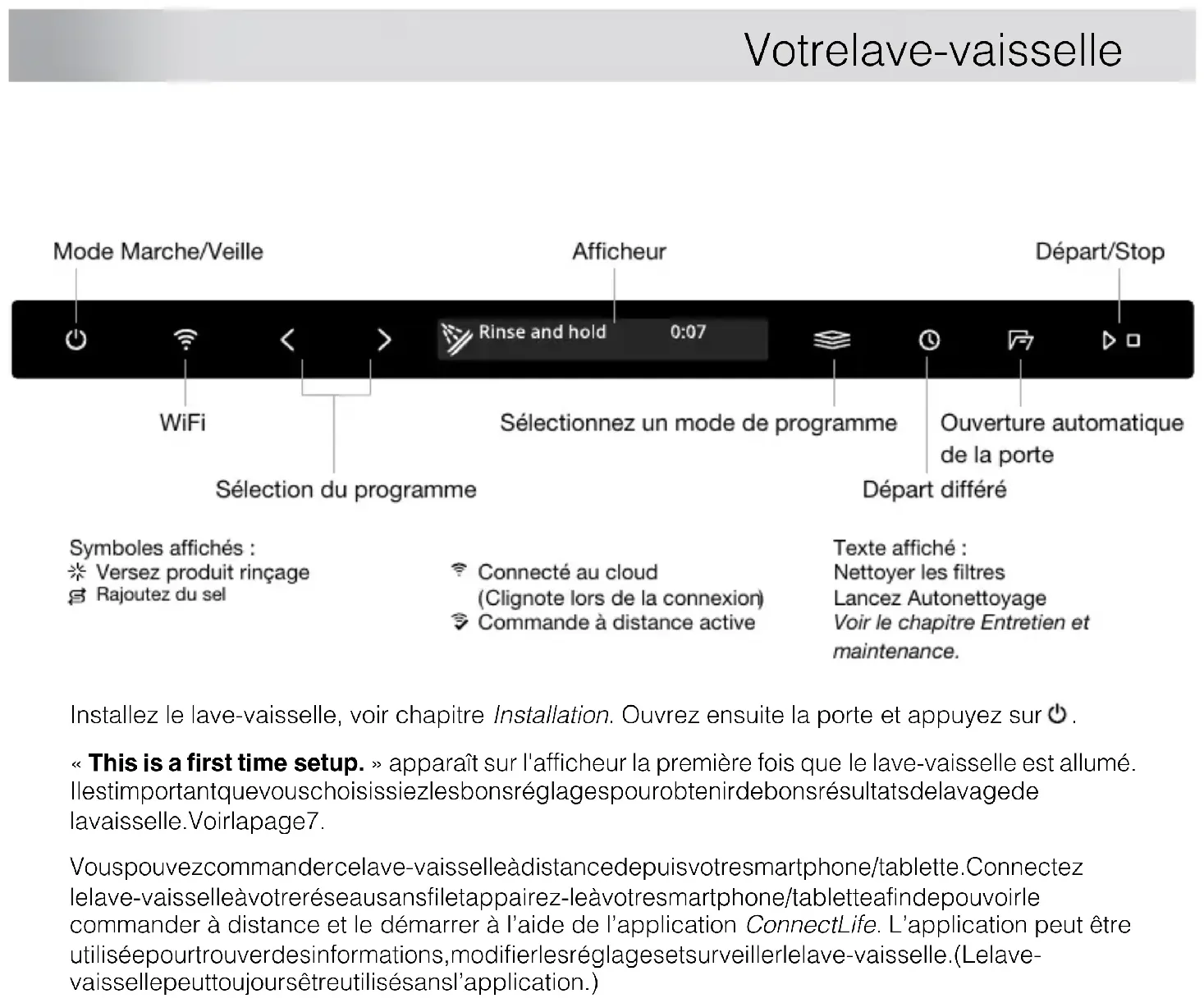 Données techniques et performances énergétiques ............................................... 52Données techniques .................................... 52Informations pour les consommateurs ........ 52Informations pour le laboratoire d’essais ..... 52Déclaration de conformité ........................... Tables des matièresRajoutez du sel Afficheur Départ/Stop Sélectionnez un mode de programme Sélection du programme Ouverture automatique de la porte Départ différé Mode Marche/Veille WiFi Connecté au cloud (Clignote lors de laconnexion) Symboles affichés: Versez produit rinçage Texte affiché: Nettoyer les filtres Lancez Autonettoyage Voir le chapitre Entretien et maintenance. Commande à distance active Installez le lave-vaisselle, voir chapitre Installation. Ouvrez ensuite la porte et appuyez sur . « This is a first time setup. » apparaît sur l'afficheur la première fois que le lave-vaisselle est allumé. Il est important que vous choisissiez les bons réglages pour obtenir de bons résultats de lavage de la vaisselle. Voir la page 7. Vous pouvez commander ce lave-vaisselle à distance depuis votre smartphone/tablette. Connectez le lave-vaisselle à votre réseau sans fil et appairez-le à votre smartphone/tablette afin de pouvoir le commander à distance et le démarrer à l’aide de l’application ConnectLife. L’application peut être utilisée pour trouver des informations, modifier les réglages et surveiller le lave-vaisselle. (Le lave- vaisselle peut toujours être utilisé sans l’application.)
