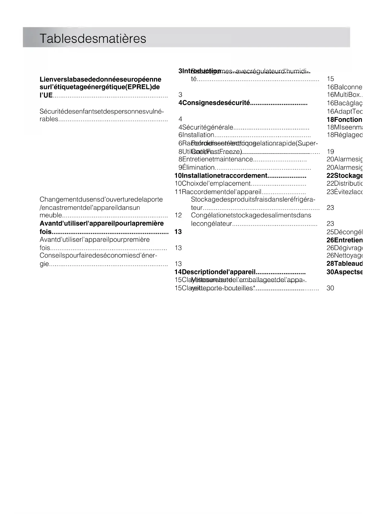 Congélation et stockage des aliments dans le congélateur .............................................. 25Décongélation des surgelés ........................ 26Entretien ..................................................... 26Dégivrage de l'appareil ............................... 26Nettoyage de l'appareil ............................... 28Tableau des problèmes ............................. 30Aspects environnementaux ......................