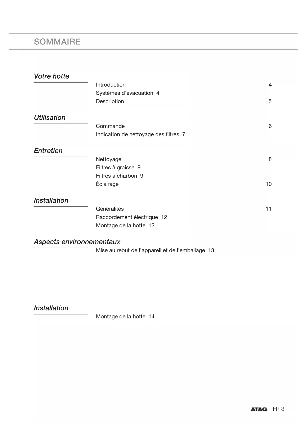- polystyrène exempt de CFC (mousse PS rigide). Éliminez ces matériaux de manière responsable et conformément aux réglementations locales en vigueur. Cet appareil porte le symbole d’une poubelle barrée d’une croix afin d’attirer votre attention sur le tri sélectif et la nécessité d’éliminer les appareils ménagers domestiques séparément des ordures ménagères. Cela signifie que l’appareil ne peut pas être mis au rebut avec les déchets ménagers non sujets au tri sélectif à la fin de son cycle de vie. Cet appareil doit être déposé dans un centre municipal spécial de collecte et de tri des déchets, ou chez un revendeur assurant ce service. La collecte et la mise au rebut séparées des appareils ménagers évitent les conséquences néfastes pour la santé et l’environnement. Cela permet de récupérer et de recycler les matériaux constitutifs de l’appareil afin de réaliser des économies substantielles d’énergie et de matières brutes. Déclaration de conformité Nous déclarons par la présente que nos produits satisfont aux directives, réglementations et exigences européennes en vigueur ainsi qu’aux exigences mentionnées dans les normes auxquelles il est fait référence.FR 14DE 3 INHALT Ihre Dunstabzugshaube Einführung 4 Absaugsysteme 4 Beschreibung 5 Verwendung Bedienung 6 Anzeige der Filterreinigung 7 Pflege Reinigung 8 Fettfilter 9 Kohlefilter 9 Beleuchtung 10 Installation Allgemeines 11 Elektrische Anschlüsse 12 Montage der Haube 12 Umweltschutz Entsorgung von Gerät und Verpackung 13 Installation Montage der Haube 14DE 4 Einführung Herzlichen Glückwunsch zum Kauf dieser Dunstabzugshaube von Atag. Beim Entwurf dieses Produktes haben wir besonders die simple Bedienung und optimale Benutzerfreundlichkeit in den Mittelpunkt gestellt. Die Dunstabzugshaube arbeitet geräuschlos und mit maximalem Wirkungsgrad. Kochgerüche gehören damit endgültig der Vergangenheit an. Lesen Sie vor der Verwendung des Gerätes die separaten Sicherheitshinweise! Lesen Sie diese Bedienungsanleitung vor der ersten Inbetriebnahme des Geräts bitte sorgfältig durch und heben Sie diese zum späteren Nachlesen gut auf. Die neueste Version der Bedienungsanleitung finden Sie auf unserer Website. Absaugsysteme Es gibt zwei verschiedene Methoden für den Anschluss derDunstabzugshaube:
