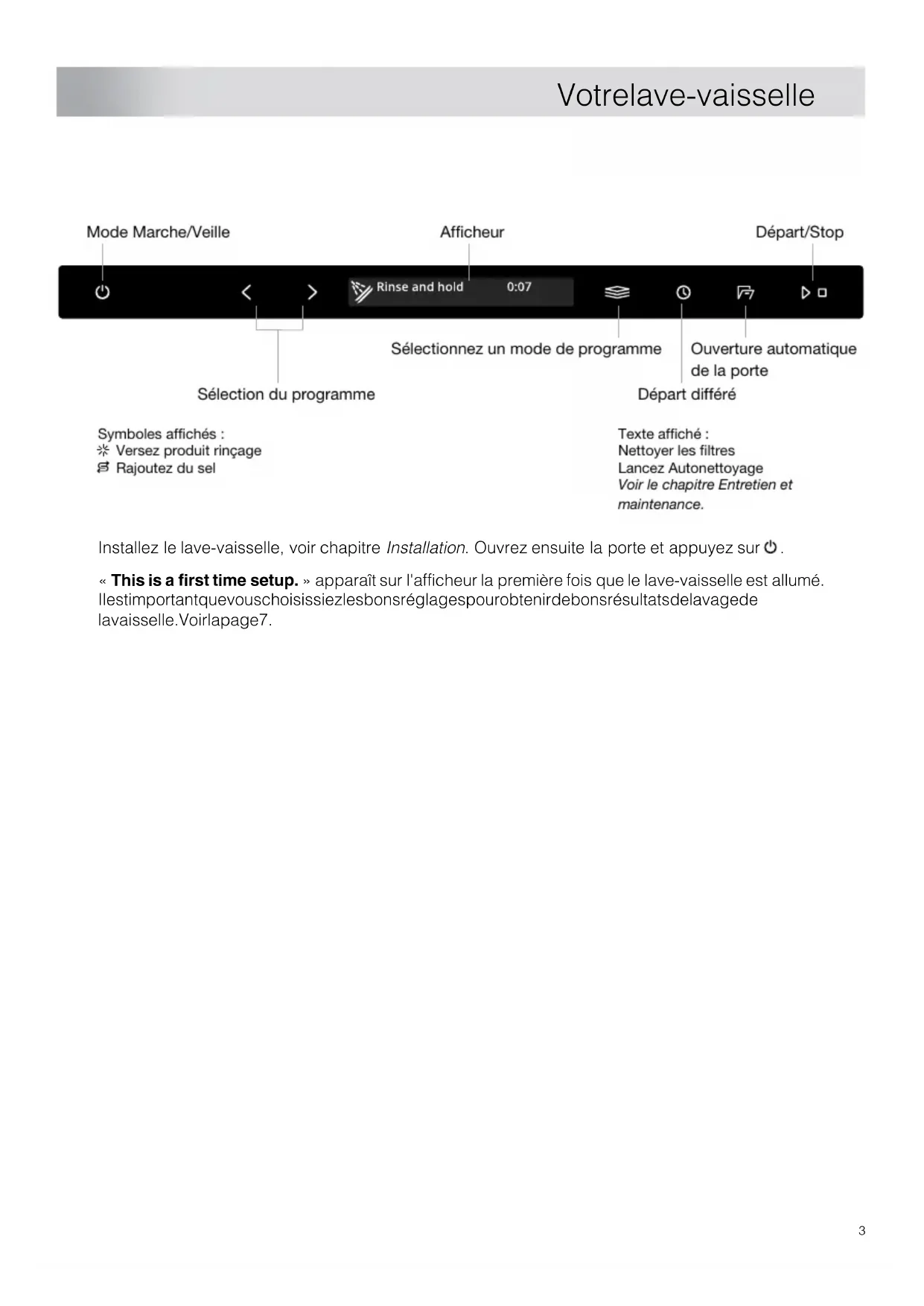 Données techniques et performances énergétiques ............................................... 43Données techniques .................................... 43Informations pour les consommateurs ........ 43Informations pour le laboratoire d’essais ..... 43Déclaration de conformité ........................... Tables des matièresRajoutez du sel Afficheur Départ/Stop Sélectionnez un mode de programme Sélection du programme Ouverture automatique de la porte Départ différé Mode Marche/Veille Symboles affichés: Versez produit rinçage Texte affiché: Nettoyer les filtres Lancez Autonettoyage Voir le chapitre Entretien et maintenance. Installez le lave-vaisselle, voir chapitre Installation. Ouvrez ensuite la porte et appuyez sur . « This is a first time setup. » apparaît sur l'afficheur la première fois que le lave-vaisselle est allumé. Il est important que vous choisissiez les bons réglages pour obtenir de bons résultats de lavage de la vaisselle. Voir la page 7.