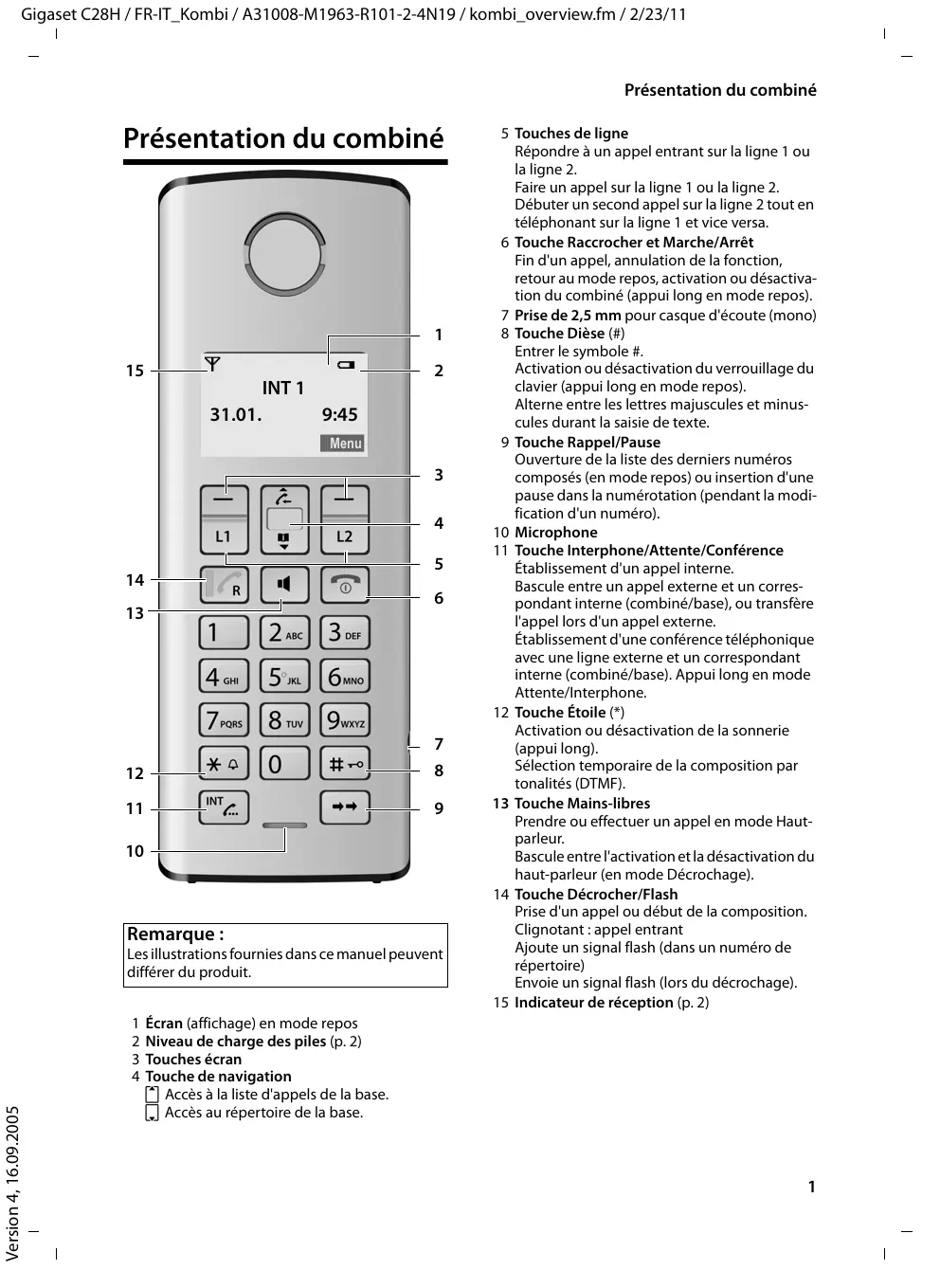 Gigaset C28H / FR-IT_Kombi / A31008-M1963-R101-2-4N19 / kombi_overview.fm / 2/23/11 Présentation du combiné Présentation du combiné