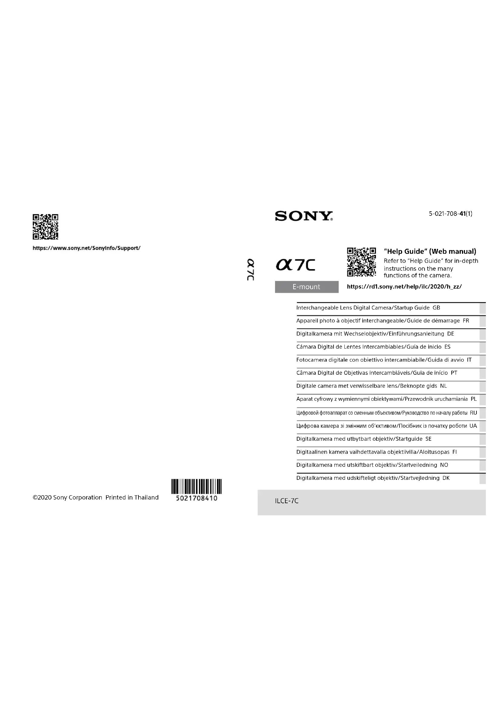 - XAVC S et sont des marques déposées de Sony Corporation.• USB Type-C® et USB-C® sont des marques déposées de USB Implementers Forum.• Android et Google Play sont des marques commerciales ou des marques déposées de Google LLC.• Wi-Fi, le logo Wi-Fi et Wi-Fi Protected Setup sont des marques commerciales ou des marques déposées de Wi-Fi Alliance. • QR Code est une marque commerciale de Denso Wave Inc. • En outre, les noms de système et de produit utilisés dans ce manuel sont généralement des marques commerciales ou des marques déposées de leurs créateurs ou fabricants respectifs. Cependant, les symboles ™ ou ne sont pas systématiquement utilisés dans ce manuel.Des informations complémentaires sur ce produit et des réponses à des questions fréquemment posées sont disponibles sur notre site Web d’assistance client.ILCE-7C5-021-708-41(1)