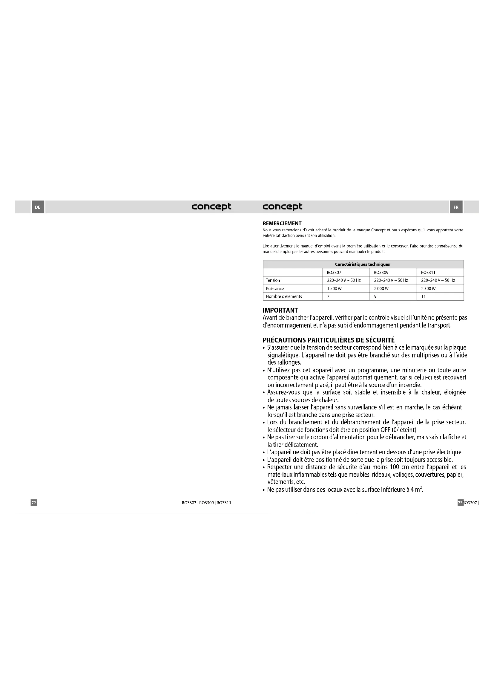 72 RO3307 | RO3309 | RO3311 Caractéristiques techniques RO3307 RO3309 RO3311 Tension 220–240 V~ 50 Hz 220–240 V~ 50 Hz 220–240 V~ 50 Hz Puissance 1 500 W 2 000 W 2 300 W Nombre d’éléments 7 9 11• La grille d’entrée et de sortie d’air doit rester dégagée (au moins 100 cm devant et 50 cm derrière l’appareil). Attention ! Lorsque l’appareil est mis en service, la grille de sortie atteint une température supérieure à 80 °C. Ne pas la toucher, elle représente un risque de brûlure.