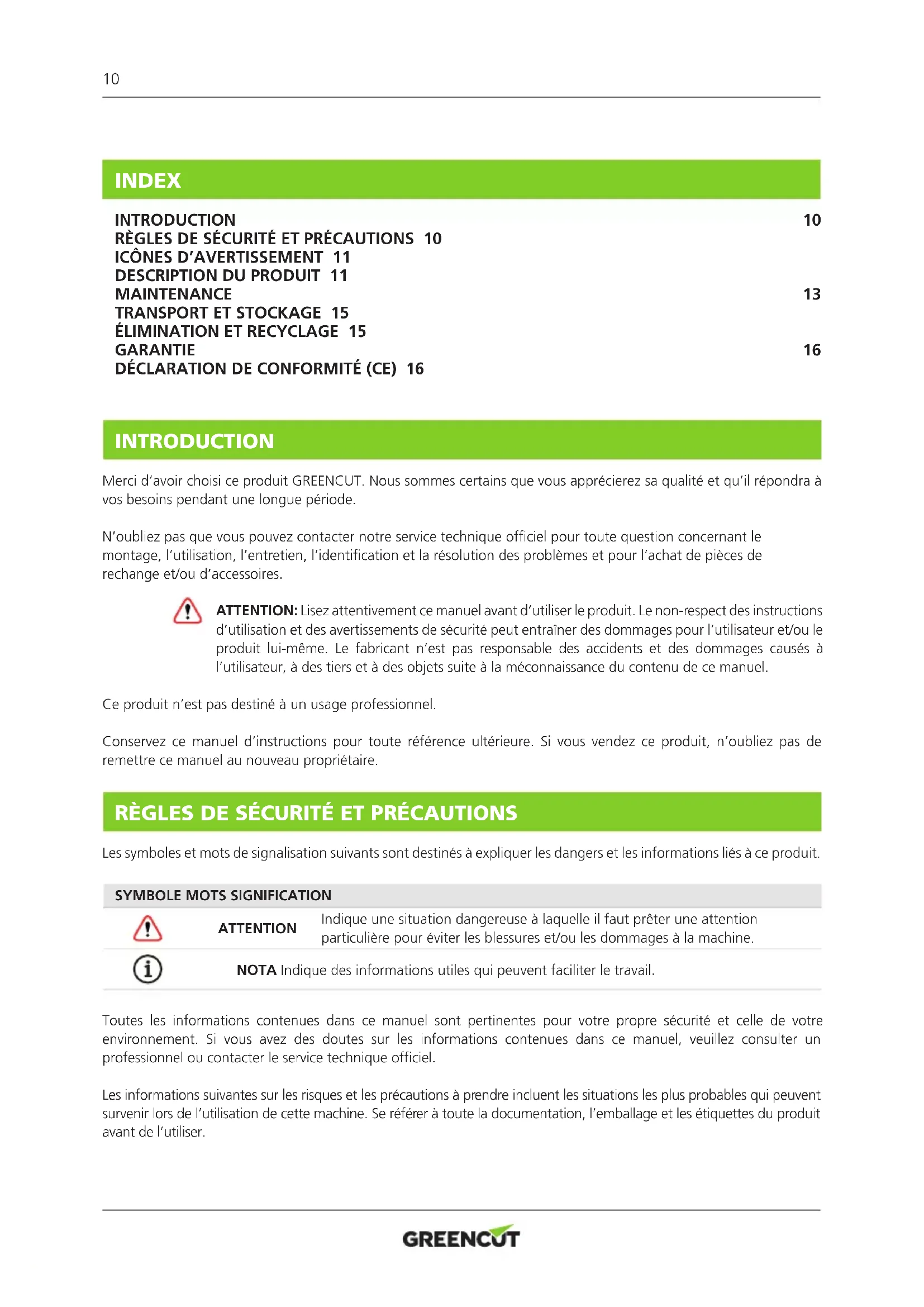 INTRODUCTION Merci d’avoir choisi ce produit GREENCUT. Nous sommes certains que vous apprécierez sa qualité et qu’il répondra à vos besoins pendant une longue période. N’oubliez pas que vous pouvez contacter notre service technique ofciel pour toute question concernant le montage, l’utilisation, l’entretien, l’identication et la résolution des problèmes et pour l’achat de pièces de rechange et/ou d’accessoires. ATTENTION: Lisez attentivement ce manuel avant d’utiliser le produit. Le non-respect des instructions d’utilisation et des avertissements de sécurité peut entraîner des dommages pour l’utilisateur et/ou le produit lui-même. Le fabricant n’est pas responsable des accidents et des dommages causés à l’utilisateur, à des tiers et à des objets suite à la méconnaissance du contenu de ce manuel. Ce produit n’est pas destiné à un usage professionnel. Conservez ce manuel d’instructions pour toute référence ultérieure. Si vous vendez ce produit, n’oubliez pas de remettre ce manuel au nouveau propriétaire. RÈGLES DE SÉCURITÉ ET PRÉCAUTIONS Les symboles et mots de signalisation suivants sont destinés à expliquer les dangers et les informations liés à ce produit.