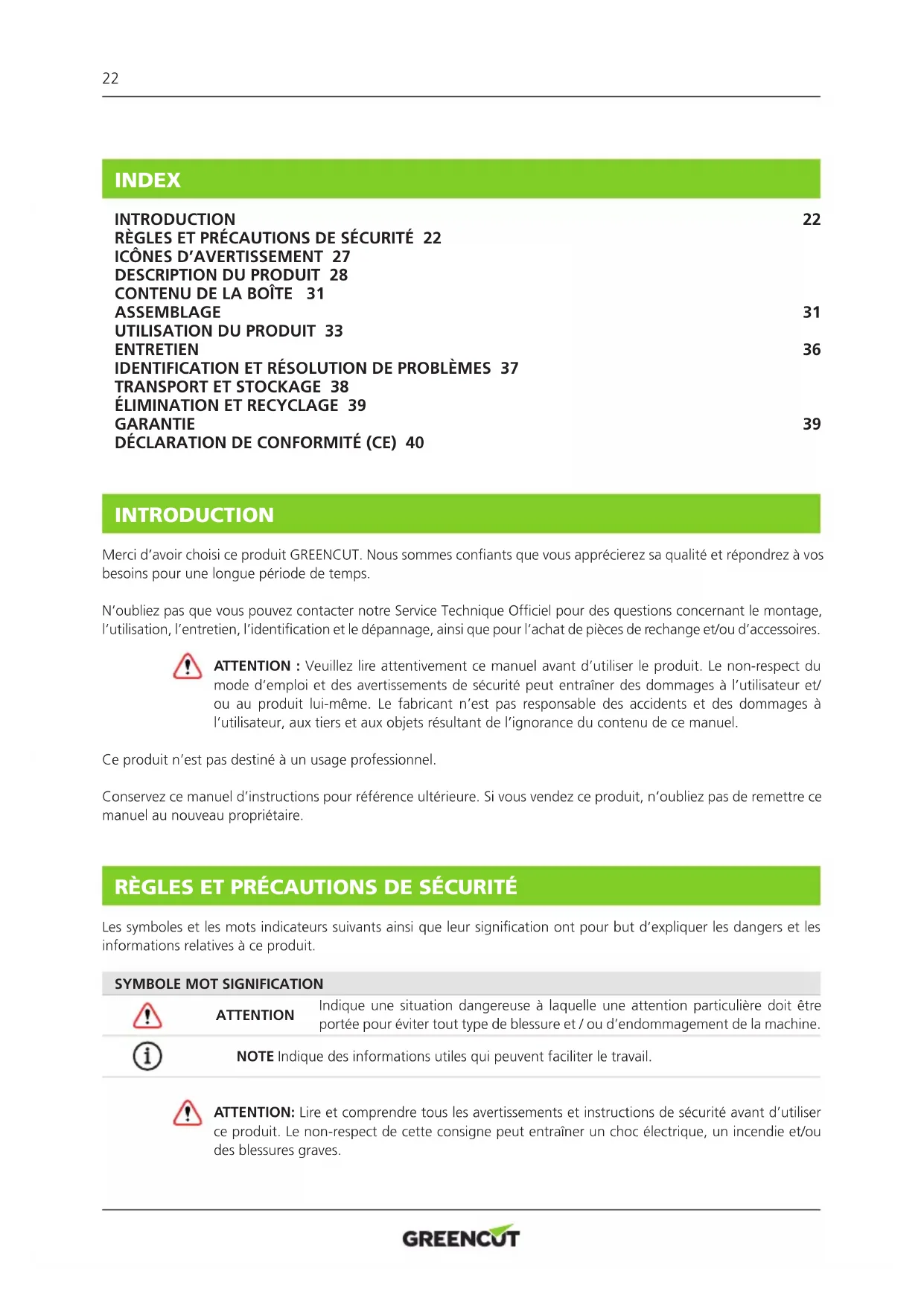 - Directiva 2012/46/UE de la Comisión, de 6 de diciembre de 2012 , por la que se modica la Directiva 97/68/CE del Parlamento Europeo y del Consejo, relativa a la aproximación de las legislaciones de los Estados miembros sobre medidas contra la emisión de gases y partículas contaminantes procedentes de los motores de combustión interna que se instalen en las máquinas móviles no de carretera. Normas armonizadas: EN ISO 11681-1:2011, EN ISO 11681-2:2011, EN 55012:2007+A1:2009, EN 61000-6-1:2007 El producto entregado coincide con el ejemplar que fue sometido al examen CE de tipo. Torredembarra,14 de septiembre de 2016, Albert Prat Asensio, CEO (Representante autorizado y responsable de la documentación técnica)22 INTRODUCTION Merci d’avoir choisi ce produit GREENCUT. Nous sommes conants que vous apprécierez sa qualité et répondrez à vos besoins pour une longue période de temps. N’oubliez pas que vous pouvez contacter notre Service Technique Ofciel pour des questions concernant le montage, l’utilisation, l’entretien, l’identication et le dépannage, ainsi que pour l’achat de pièces de rechange et/ou d’accessoires. ATTENTION : Veuillez lire attentivement ce manuel avant d’utiliser le produit. Le non-respect du mode d’emploi et des avertissements de sécurité peut entraîner des dommages à l’utilisateur et/ ou au produit lui-même. Le fabricant n’est pas responsable des accidents et des dommages à l’utilisateur, aux tiers et aux objets résultant de l’ignorance du contenu de ce manuel. Ce produit n’est pas destiné à un usage professionnel. Conservez ce manuel d’instructions pour référence ultérieure. Si vous vendez ce produit, n’oubliez pas de remettre ce manuel au nouveau propriétaire. RÈGLES ET PRÉCAUTIONS DE SÉCURITÉ Les symboles et les mots indicateurs suivants ainsi que leur signication ont pour but d’expliquer les dangers et les informations relatives à ce produit. ATTENTION: Lire et comprendre tous les avertissements et instructions de sécurité avant d’utiliser ce produit. Le non-respect de cette consigne peut entraîner un choc électrique, un incendie et/ou des blessures graves.