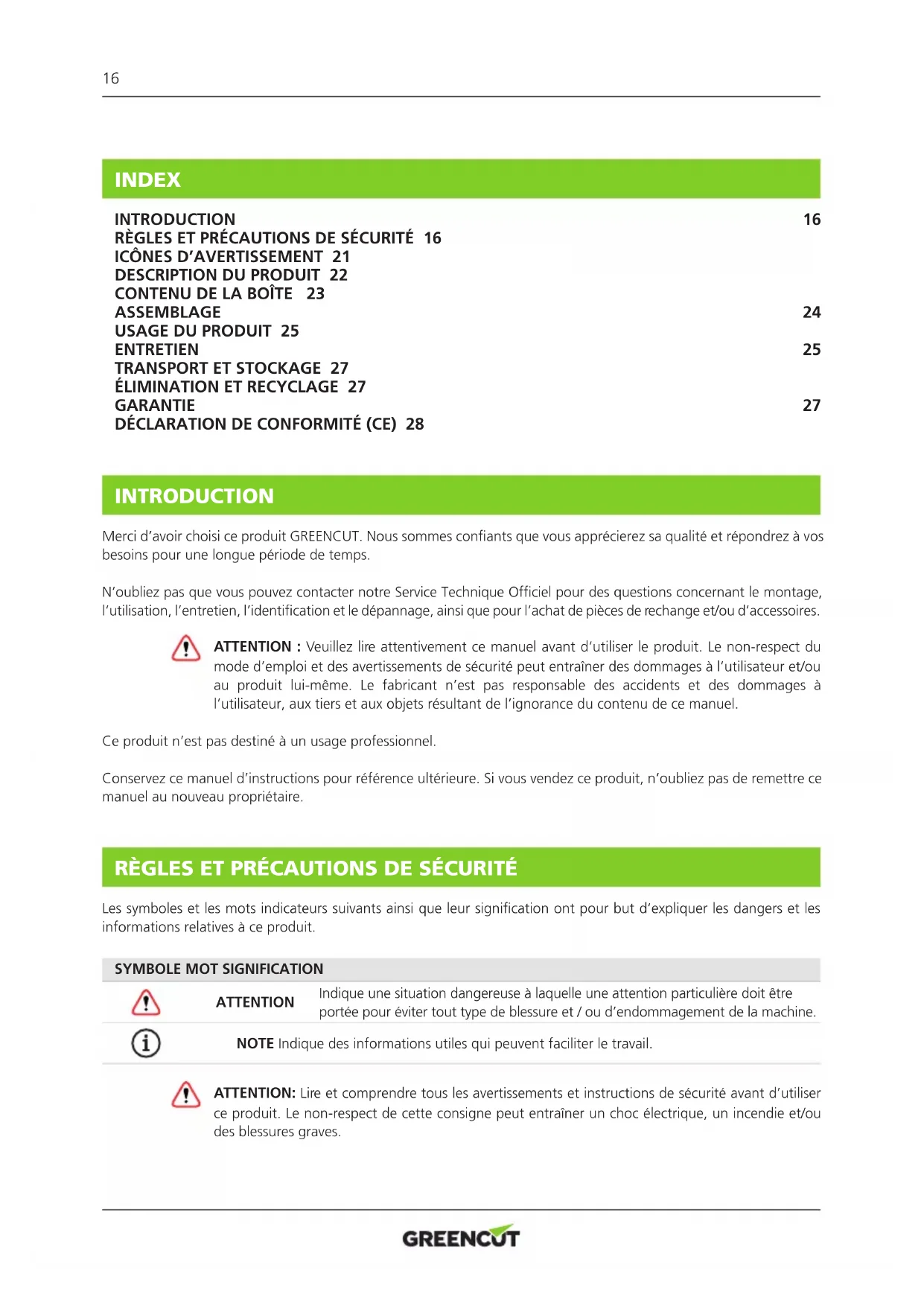 INTRODUCTION Merci d’avoir choisi ce produit GREENCUT. Nous sommes conants que vous apprécierez sa qualité et répondrez à vos besoins pour une longue période de temps. N’oubliez pas que vous pouvez contacter notre Service Technique Ofciel pour des questions concernant le montage, l’utilisation, l’entretien, l’identication et le dépannage, ainsi que pour l’achat de pièces de rechange et/ou d’accessoires. ATTENTION : Veuillez lire attentivement ce manuel avant d’utiliser le produit. Le non-respect du mode d’emploi et des avertissements de sécurité peut entraîner des dommages à l’utilisateur et/ou au produit lui-même. Le fabricant n’est pas responsable des accidents et des dommages à l’utilisateur, aux tiers et aux objets résultant de l’ignorance du contenu de ce manuel. Ce produit n’est pas destiné à un usage professionnel. Conservez ce manuel d’instructions pour référence ultérieure. Si vous vendez ce produit, n’oubliez pas de remettre ce manuel au nouveau propriétaire. RÈGLES ET PRÉCAUTIONS DE SÉCURITÉ Les symboles et les mots indicateurs suivants ainsi que leur signication ont pour but d’expliquer les dangers et les informations relatives à ce produit.