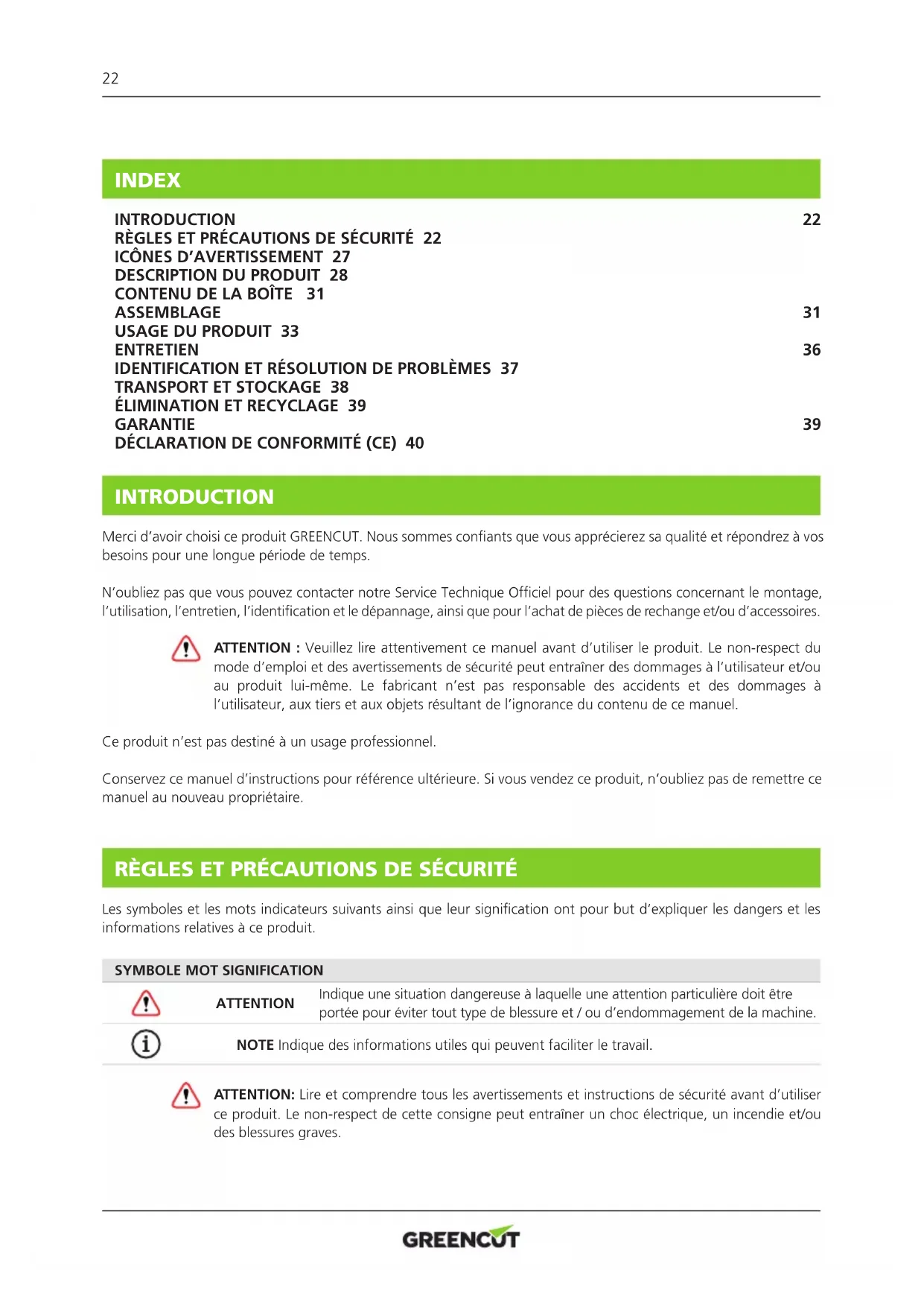 - Directiva 2012/46/UE de la Comisión, de 6 de diciembre de 2012 , por la que se modica la Directiva 97/68/CE del Parlamento Europeo y del Consejo, relativa a la aproximación de las legislaciones de los Estados miembros sobre medidas contra la emisión de gases y partículas contaminantes procedentes de los motores de combustión interna que se instalen en las máquinas móviles no de carretera. Normas armonizadas: EN ISO 11681-1:2011, EN ISO 11681-2:2011, EN 55012:2007+A1:2009, EN 61000-6-1:2007 El producto entregado coincide con el ejemplar que fue sometido al examen CE de tipo. Valls, 18 mayo 2023 Mireia Calvet, CEO (Representante autorizado y responsable de la documentación técnica).22 INTRODUCTION Merci d’avoir choisi ce produit GREENCUT. Nous sommes conants que vous apprécierez sa qualité et répondrez à vos besoins pour une longue période de temps. N’oubliez pas que vous pouvez contacter notre Service Technique Ofciel pour des questions concernant le montage, l’utilisation, l’entretien, l’identication et le dépannage, ainsi que pour l’achat de pièces de rechange et/ou d’accessoires. ATTENTION : Veuillez lire attentivement ce manuel avant d’utiliser le produit. Le non-respect du mode d’emploi et des avertissements de sécurité peut entraîner des dommages à l’utilisateur et/ou au produit lui-même. Le fabricant n’est pas responsable des accidents et des dommages à l’utilisateur, aux tiers et aux objets résultant de l’ignorance du contenu de ce manuel. Ce produit n’est pas destiné à un usage professionnel. Conservez ce manuel d’instructions pour référence ultérieure. Si vous vendez ce produit, n’oubliez pas de remettre ce manuel au nouveau propriétaire. RÈGLES ET PRÉCAUTIONS DE SÉCURITÉ Les symboles et les mots indicateurs suivants ainsi que leur signication ont pour but d’expliquer les dangers et les informations relatives à ce produit.