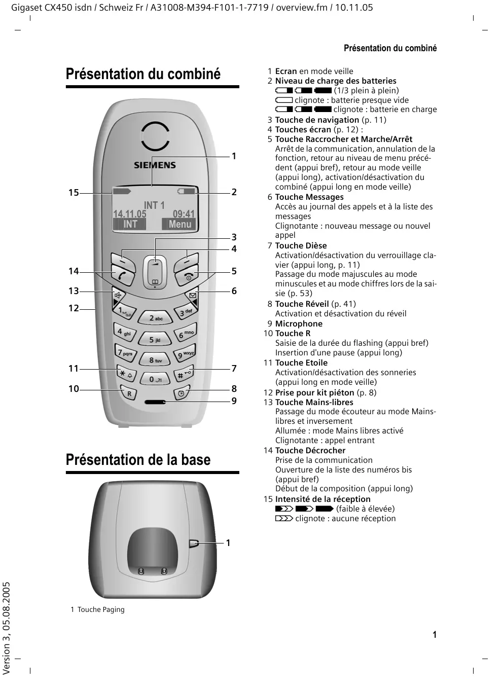 Présentation de la base 1 Ecran en mode veille 2 Niveau de charge des batteries e V U (1/3 plein à plein) = clignote : batterie presque vide e V U clignote : batterie en charge 3 Touche de navigation (p. 11) 4 Touches écran (p. 12) : 5 Touche Raccrocher et Marche/Arrêt Arrêt de la communication, annulation de la fonction, retour au niveau de menu précédent (appui bref), retour au mode veille (appui long), activation/désactivation du combiné (appui long en mode veille) 6 Touche Messages Accès au journal des appels et à la liste des messages Clignotante : nouveau message ou nouvel appel 7 Touche Dièse Activation/désactivation du verrouillage clavier (appui long, p. 11) Passage du mode majuscules au mode minuscules et au mode chiffres lors de la saisie (p. 53) 8 Touche Réveil (p. 41) Activation et désactivation du réveil 9 Microphone 10 Touche R Saisie de la durée du flashing (appui bref) Insertion d'une pause (appui long) 11 Touche Etoile Activation/désactivation des sonneries (appui long en mode veille) 12 Prise pour kit piéton (p. 8) 13 Touche Mains-libres Passage du mode écouteur au mode Mainslibres et inversement Allumée : mode Mains libres activé Clignotante : appel entrant 14 Touche Décrocher Prise de la communication Ouverture de la liste des numéros bis (appui bref) Début de la composition (appui long) 15 Intensité de la réception ¦ § ¨ (faible à élevée) ¥ clignote : aucune réception Version 3, 05.08.2005