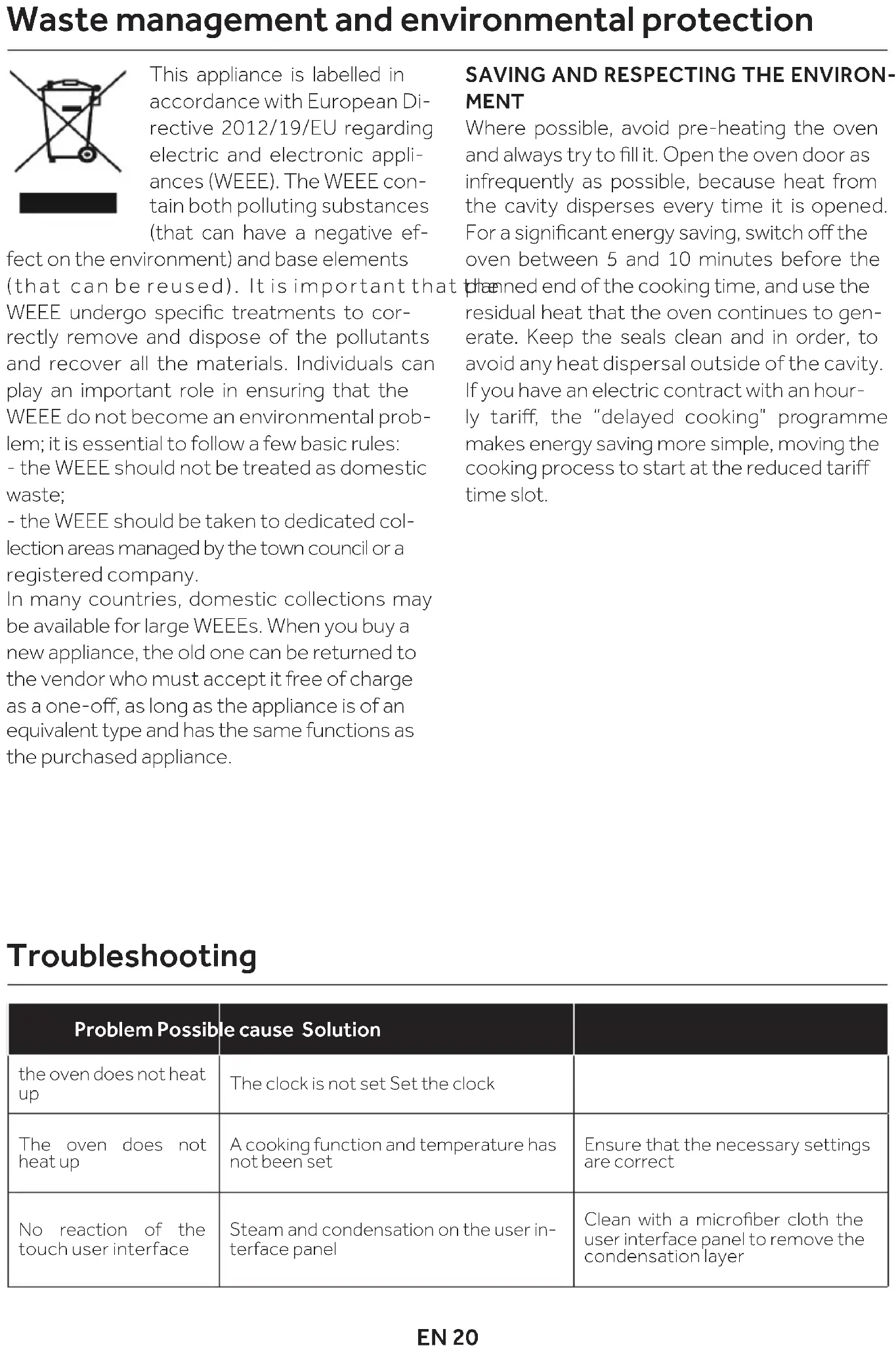 - Ils doivent être remis aux points de collecte appropriés gérés par la municipalité ou par des sociétés immatriculées. Dans plusieurs pays, il est possible de collecter à domicile les DEEE volumineux. Dépannage Problemes Cause possible Solution le four ne chaue pas L’horloge n’est pas réglée Réglez l’horlogeLe four ne chaue pasLa sécurité enfant estactivéeDésactiver la sécurité enfantLe four ne chaue pasLes réglages nécessairesne sont pas imposésAssurez-vous que lesparamètres nécessairessont corrects