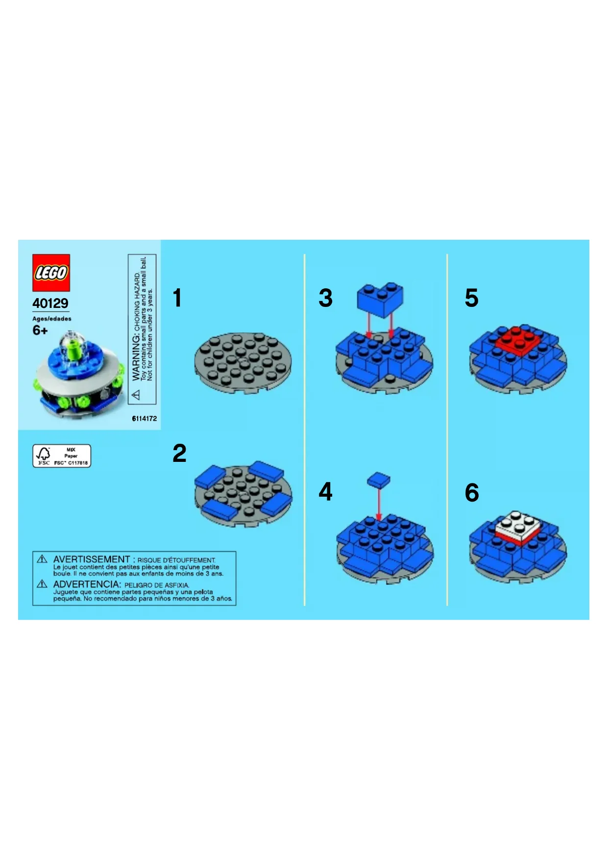 Le LEGO UFO 40129 n'est pas recommandé pour les enfants de moins de 3 ans en raison de petites pièces qui peuvent présenter un risque d'étouffement.
