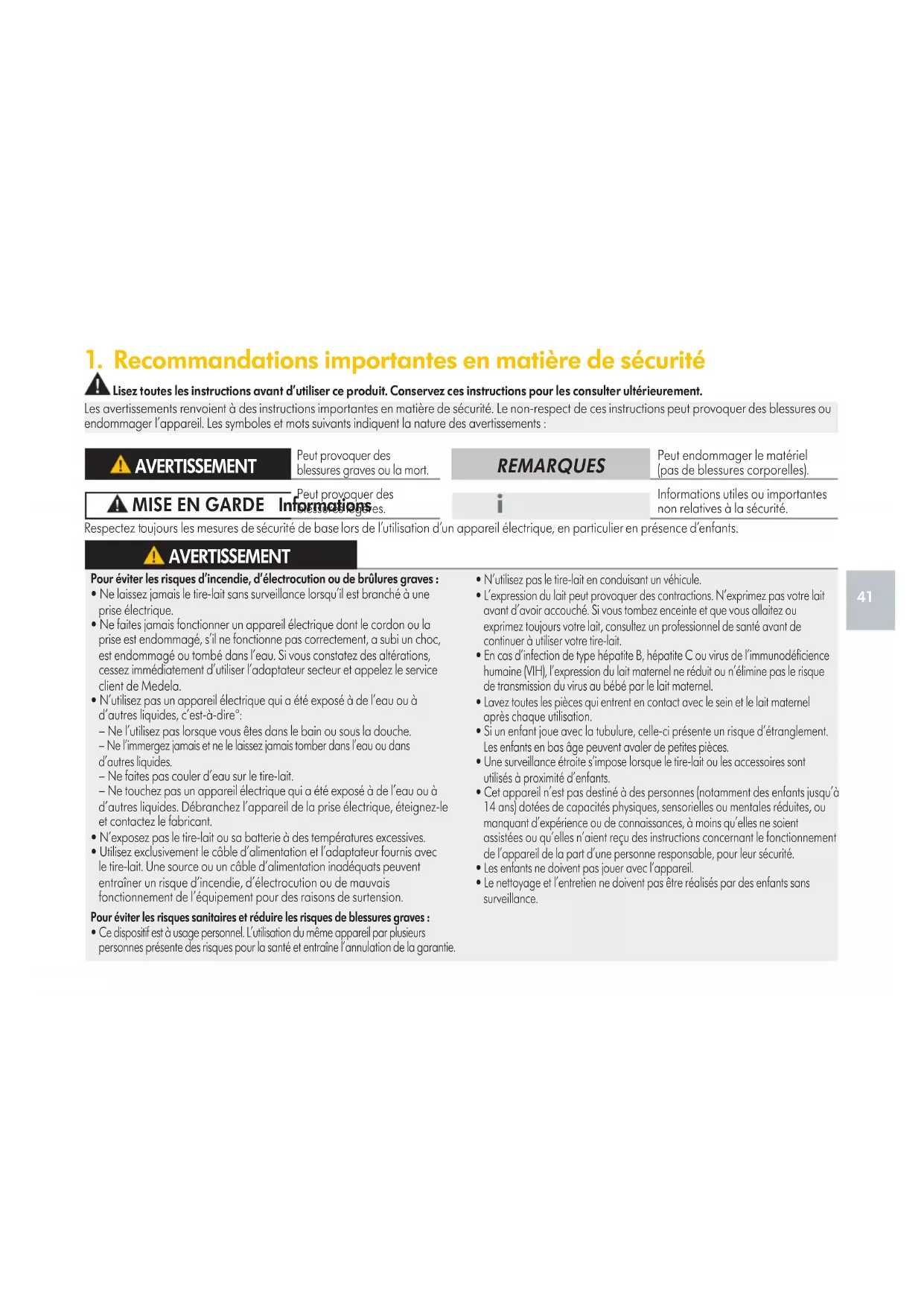 - Utilisez exclusivement le câble d’alimentation et l’adaptateur fournis avec le tire-lait. Une source ou un câble d’alimentation inadéquats peuvent entraîner un risque d’incendie, d’électrocution ou de mauvais fonctionnement de l’équipement pour des raisons de surtension. Pour éviter les risques sanitaires et réduire les risques de blessures graves: