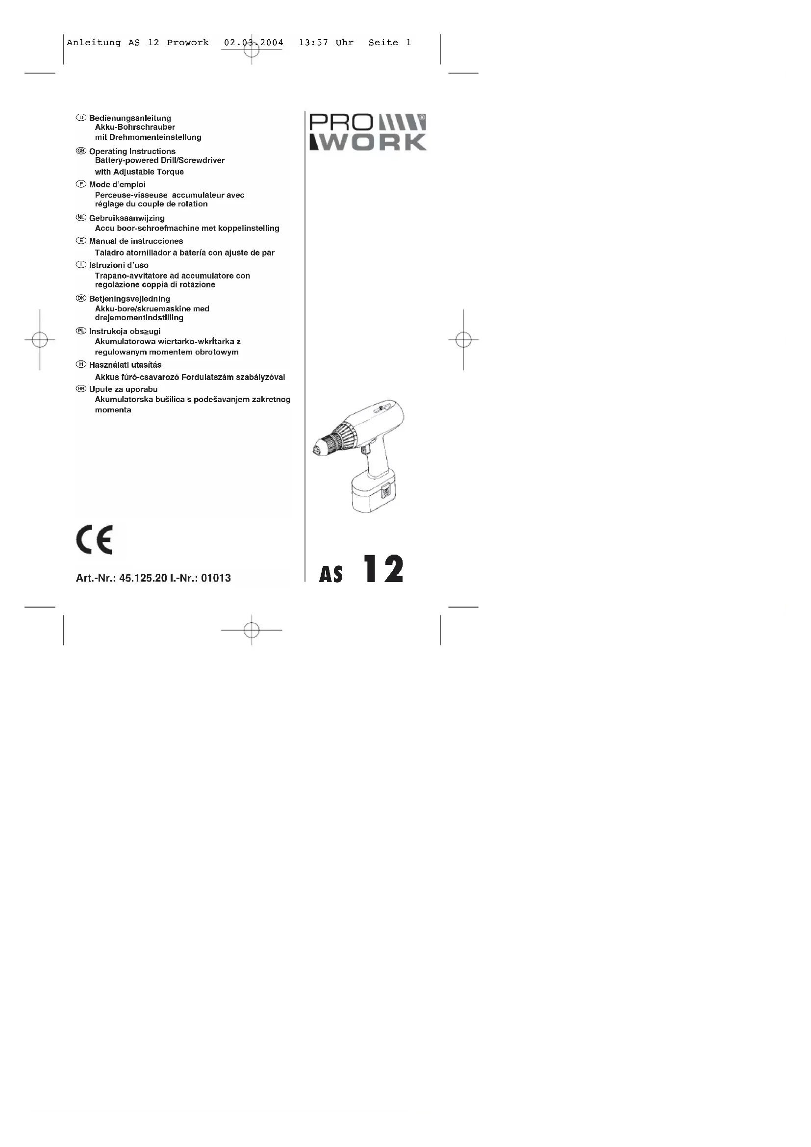 AS 12 - Perceuse Prowork - Notice d'utilisation et mode d'emploi gratuit