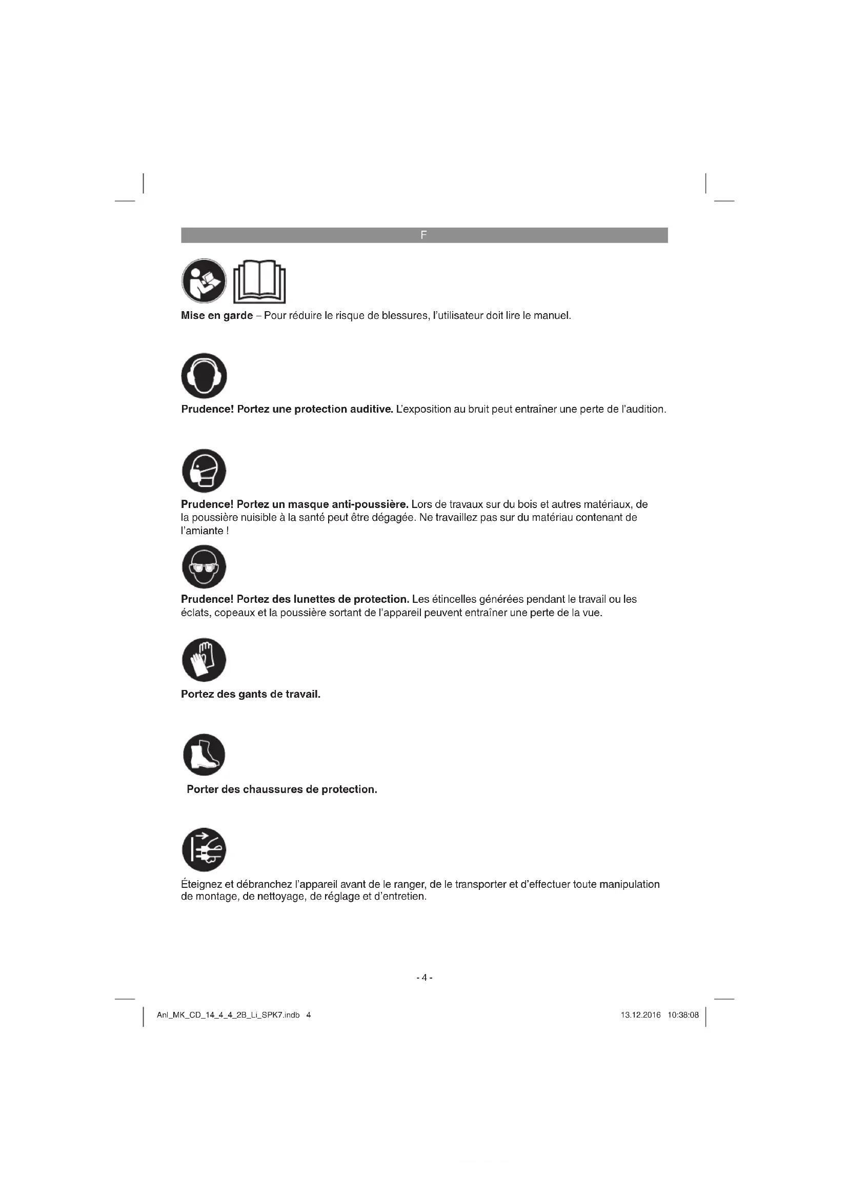 Mise en garde – Pour réduire le risque de blessures, l’utilisateur doit lire le manuel. Prudence! Portez une protection auditive. L’exposition au bruit peut entraîner une perte de l’audition. Prudence! Portez des lunettes de protection. Les étincelles générées pendant le travail ou les éclats, copeaux et la poussière sortant de l’appareil peuvent entraîner une perte de la vue. Prudence! Portez un masque anti-poussière. Lors de travaux sur du bois et autres matériaux, de la poussière nuisible à la santé peut être dégagée. Ne travaillez pas sur du matériau contenant de l’amiante ! Portez des gants de travail. Porter des chaussures de protection. Éteignez et débranchez l’appareil avant de le ranger, de le transporter et d’eff ectuer toute manipulation de montage, de nettoyage, de réglage et d’entretien. Anl_MK_CD_14_4_4_2B_Li_SPK7.indb 4Anl_MK_CD_14_4_4_2B_Li_SPK7.indb 4 13.12.2016 10:38:0813.12.2016 10:38:08F