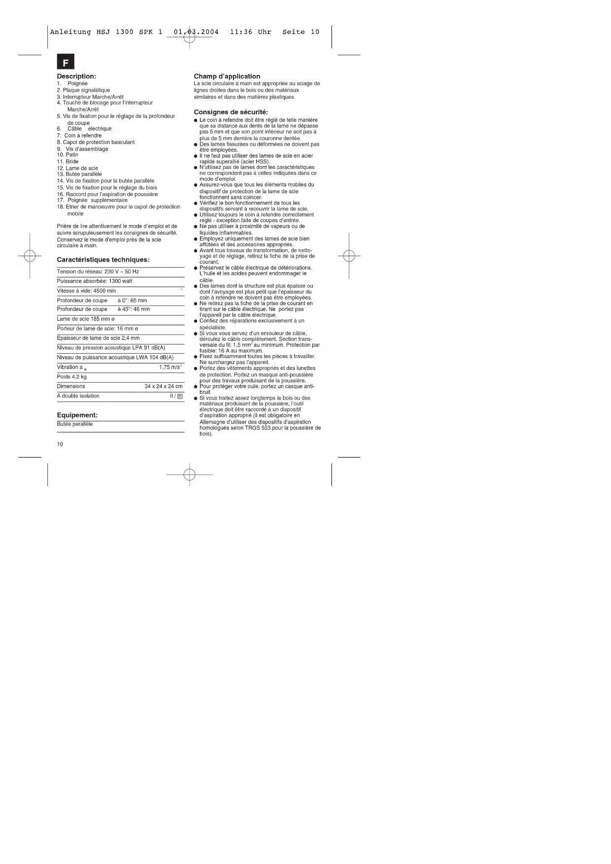 au minimum. Protection par fusible: 16 A au maximum. Fixez suffisamment toutes les pièces à travailler. Ne surchargez pas l’appareil. Portez des vêtements appropriés et des lunettes de protection. Portez un masque anti-poussière pour des travaux produisant de la poussière. Pour protéger votre ouïe, portez un casque anti- bruit. Si vous traitez assez longtemps le bois ou des matériaux produisant de la poussière, l’outil électrique doit être raccordé à un dispositif d’aspiration approprié (il est obligatoire en Allemagne d’utiliser des dispositifs d’aspiration homologués selon TRGS 553 pour la poussière de bois). Anleitung HSJ 1300 SPK 1 01.03.2004 11:36 Uhr Seite 101