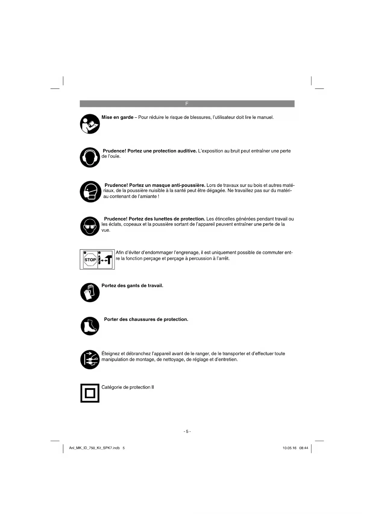 Mise en garde – Pour réduire le risque de blessures, l’utilisateur doit lire le manuel. Prudence! Portez des lunettes de protection. Les étincelles générées pendant travail ou les éclats, copeaux et la poussière sortant de l’appareil peuvent entraîner une perte de la vue. A fi n d’éviter d’endommager l’engrenage, il est uniquement possible de commuter ent- re la fonction perçage et perçage à percussion à l’arrêt. Prudence! Portez une protection auditive. L’exposition au bruit peut entraîner une perte de l’ouïe. Prudence! Portez un masque anti-poussière. Lors de travaux sur su bois et autres maté- riaux, de la poussière nuisible à la santé peut être dégagée. Ne travaillez pas sur du matéri- au contenant de l’amiante ! Portez des gants de travail. Porter des chaussures de protection. Éteignez et débranchez l’appareil avant de le ranger, de le transporter et d’eff ectuer toute manipulation de montage, de nettoyage, de réglage et d’entretien. Catégorie de protection II Anl_MK_ID_750_Kit_SPK7.indb 5Anl_MK_ID_750_Kit_SPK7.indb 5 10.05.16 08:4410.05.16 08:44F