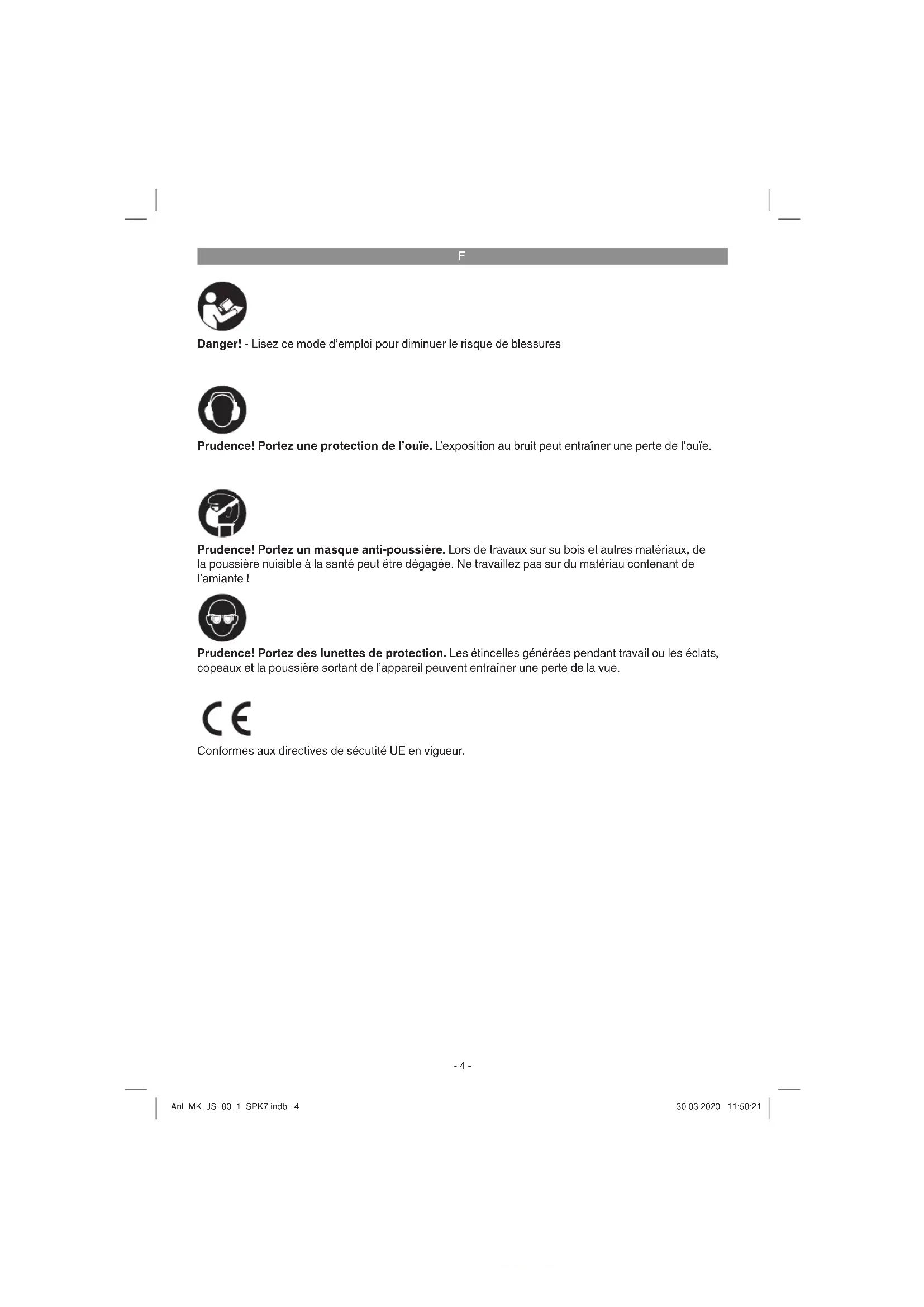 Danger! - Lisez ce mode d’emploi pour diminuer le risque de blessures Prudence! Portez une protection de l’ouïe. L’exposition au bruit peut entraîner une perte de l’ouïe. Prudence! Portez des lunettes de protection. Les étincelles générées pendant travail ou les éclats, copeaux et la poussière sortant de l’appareil peuvent entraîner une perte de la vue. Prudence! Portez un masque anti-poussière. Lors de travaux sur su bois et autres matériaux, de la poussière nuisible à la santé peut être dégagée. Ne travaillez pas sur du matériau contenant de l’amiante ! Conformes aux directives de sécutité UE en vigueur. Anl_MK_JS_80_1_SPK7.indb 4Anl_MK_JS_80_1_SPK7.indb 4 30.03.2020 11:50:2130.03.2020 11:50:21F