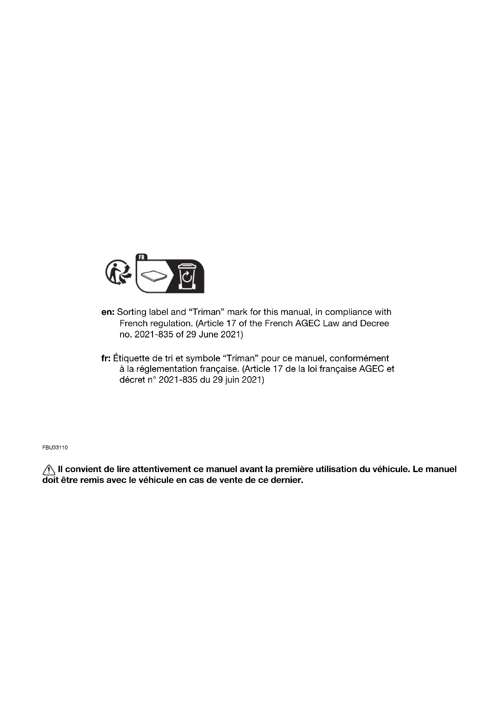 YXZ1000ET LIRE ATTENTIVEMENT CE MANUEL!Il comprend d’importantes informations de sécurité. *BDWF81997B0080* Barcode:*BDWF81997B0080*en: Sorting label and “Triman” mark for this manual, in compliance with French regulation. (Article 17 of the French AGEC Law and Decree no. 2021-835 of 29 June 2021) fr: Étiquette de tri et symbole “Triman” pour ce manuel, conformément à la réglementation française. (Article 17 de la loi française AGEC et décret n° 2021-835 du 29 juin 2021) FBU33110 Il convient de lire attentivement ce manuel avant la première utilisation du véhicule. Le manuel doit être remis avec le véhicule en cas de vente de ce dernier. UBDW7BF0.book Page 1 Friday, June 16, 2023 9:43 AMFBU31040 INTRODUCTION FBU32920 Nous vous remercions d’avoir porté votre choix sur le Yamaha YXZ1000ET. Ce modèle repré- sente en effet le fruit de nombreuses années d’expérience que Yamaha possède dans la produc- tion de véhicules de sport, de tourisme et de compétition. Ce véhicule permettra à son conduc- teur de pleinement apprécier la perfection technique et la fiabilité qui ont fait de Yamaha un chef de file dans ces domaines. Le manuel apportera à son lecteur une bonne compréhension de base des caractéristiques et du fonctionnement du véhicule. Il lui explique également les procédés d’inspection et d’entretien élémentaires. Pour tout renseignement complémentaire au sujet du fonctionnement ou de l’en- tretien de ce véhicule, prière de consulter un concessionnaire Yamaha. AVERTISSEMENT FWB03490 Il convient de lire attentivement ce manuel avant la première utilisation du véhicule. Ne ja- mais conduire ce véhicule avant de posséder une connaissance suffisante de ses com- mandes et de ses caractéristiques de fonctionnement. Un entretien régulier et soigneux, ainsi qu’une bonne technique de conduite garantiront la jouissance en toute sécurité du potentiel et de la fiabilité de ce véhicule. UBDW7BF0.book Page 1 Friday, June 16, 2023 9:43 AMFBU31080