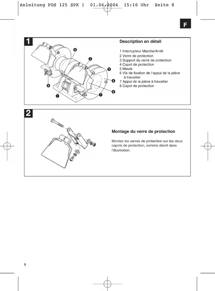 Description en détail 1 Interrupteur Marche/Arrêt 2 Verre de protection 3 Support du verre de protection 4 Capot de protection 5 Meule 6 Vis de fixation de l‘appui de la pièce à travailler 7 Appui de la pièce à travailler 8 Capot de protection Montage du verre de protection Montez les verres de protection sur les deux capots de protection, comme décrit dans l’illustration.