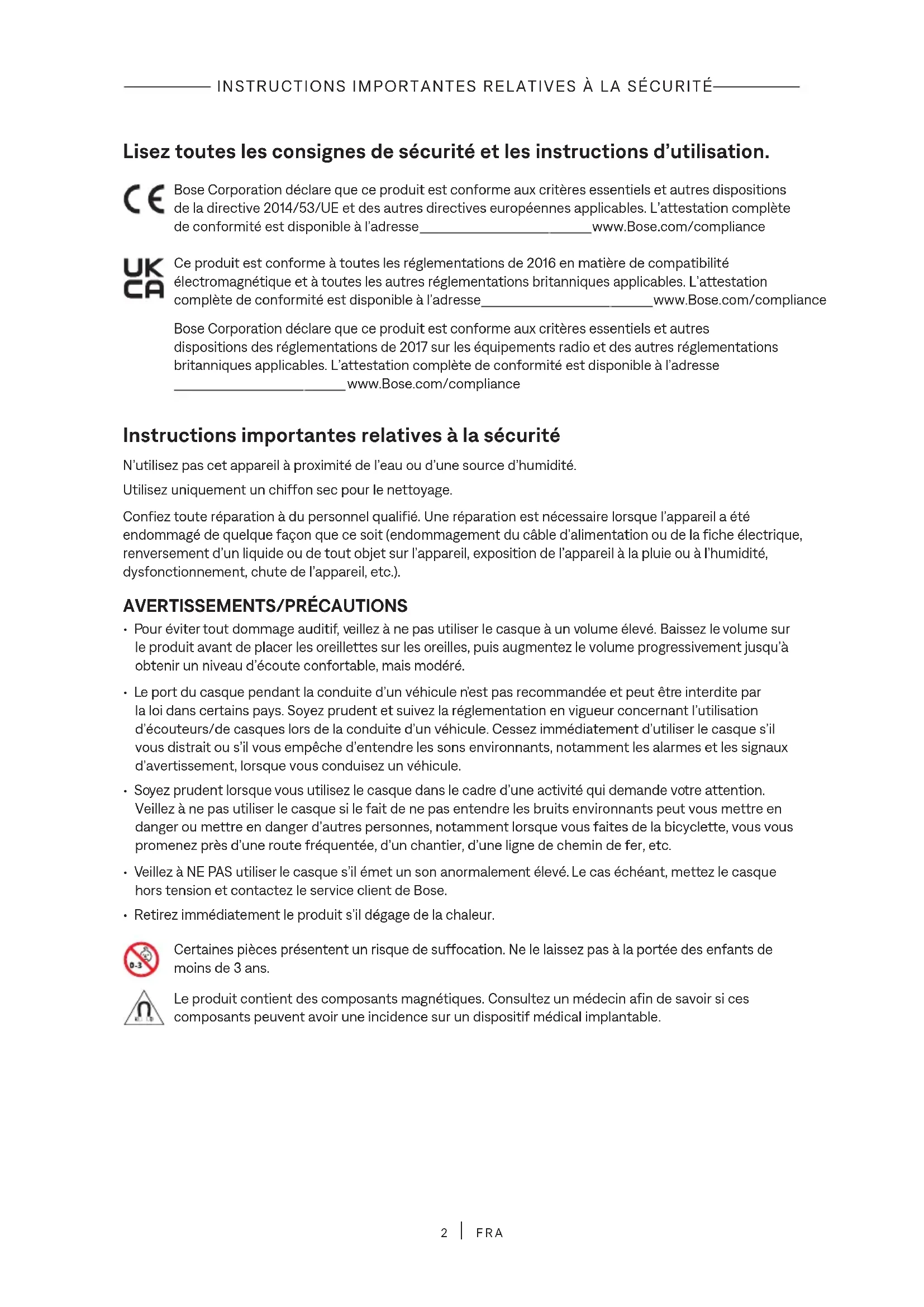 FRA Lisez toutes les consignes de sécurité et les instructions d’utilisation. Bose Corporation déclare que ce produit est conforme aux critères essentiels et autres dispositions de la directive 2014/53/UE et des autres directives européennes applicables. L’attestation complète de conformité est disponible à l’adresse www.Bose.com/compliancewww.Bose.com/compliance Ce produit est conforme à toutes les réglementations de 2016 en matière de compatibilité électromagnétique et à toutes les autres réglementations britanniques applicables. L’attestation complète de conformité est disponible à l’adresse www.Bose.com/compliancewww.Bose.com/compliance Bose Corporation déclare que ce produit est conforme aux critères essentiels et autres dispositions des réglementations de 2017 sur les équipements radio et des autres réglementations britanniques applicables. L’attestation complète de conformité est disponible à l’adresse www.Bose.com/compliancewww.Bose.com/compliance Instructions importantes relatives à la sécurité N’utilisez pas cet appareil à proximité de l’eau ou d’une source d’humidité. Utilisez uniquement un chiffon sec pour le nettoyage. Confiez toute réparation à du personnel qualifié. Une réparation est nécessaire lorsque l’appareil a été endommagé de quelque façon que ce soit (endommagement du câble d’alimentation ou de la fiche électrique, renversement d’un liquide ou de tout objet sur l’appareil, exposition de l’appareil à la pluie ou à l’humidité, dysfonctionnement, chute de l’appareil, etc.).