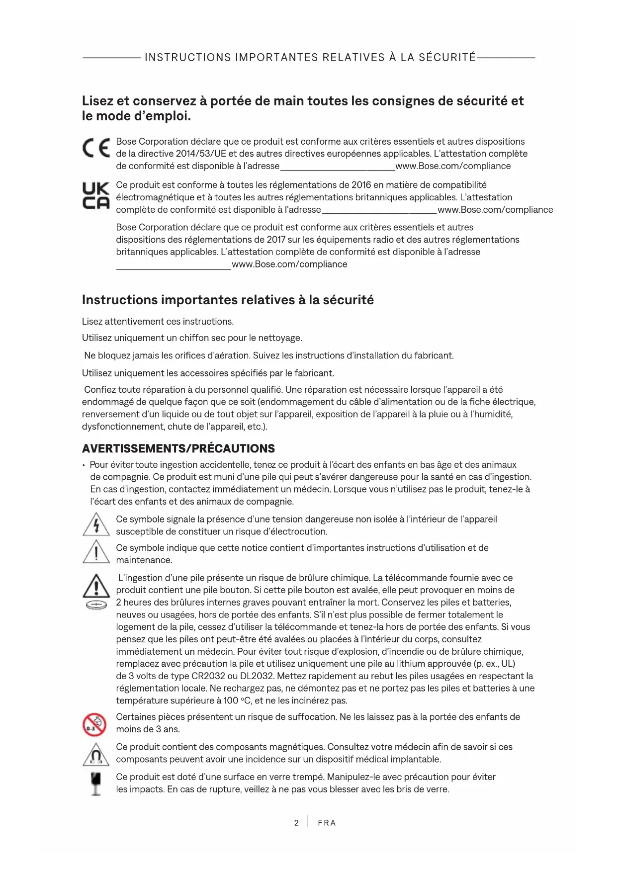 FRA Lisez et conservez à portée de main toutes les consignes de sécurité et le mode d’emploi. Bose Corporation déclare que ce produit est conforme aux critères essentiels et autres dispositions de la directive 2014/53/UE et des autres directives européennes applicables. L’attestation complète de conformité est disponible à l’adresse www.Bose.com/compliancewww.Bose.com/compliance Ce produit est conforme à toutes les réglementations de 2016 en matière de compatibilité électromagnétique et à toutes les autres réglementations britanniques applicables. L’attestation complète de conformité est disponible à l’adresse www.Bose.com/compliancewww.Bose.com/compliance Bose Corporation déclare que ce produit est conforme aux critères essentiels et autres dispositions des réglementations de 2017 sur les équipements radio et des autres réglementations britanniques applicables. L’attestation complète de conformité est disponible à l’adresse www.Bose.com/compliancewww.Bose.com/compliance Instructions importantes relatives à la sécurité Lisez attentivement ces instructions. Utilisez uniquement un chiffon sec pour le nettoyage. Ne bloquez jamais les orifices d’aération. Suivez les instructions d’installation du fabricant. Utilisez uniquement les accessoires spécifiés par le fabricant. Confiez toute réparation à du personnel qualifié. Une réparation est nécessaire lorsque l’appareil a été endommagé de quelque façon que ce soit (endommagement du câble d’alimentation ou de la fiche électrique, renversement d’un liquide ou de tout objet sur l’appareil, exposition de l’appareil à la pluie ou à l’humidité, dysfonctionnement, chute de l’appareil, etc.).