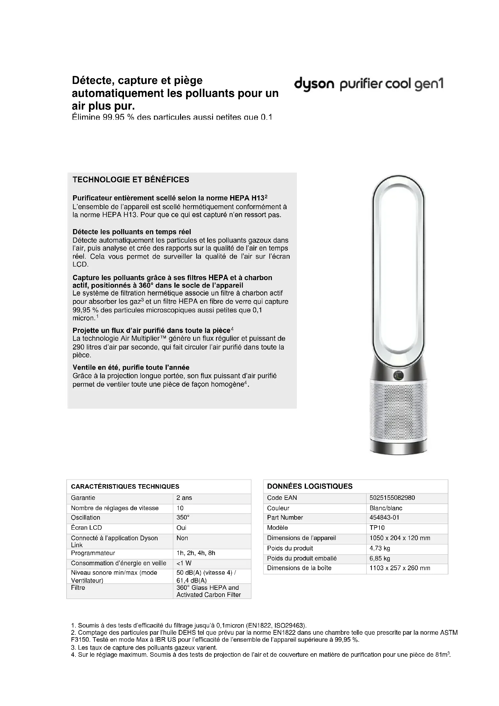 Oscillation 350° Écran LCD Oui Connecté à l’application Dyson Link Non Programmateur 1h, 2h, 4h, 8h Consommation d’énergie en veille <1 W Niveau sonore min/max (mode Ventilateur) 50 dB(A) (vitesse 4) / 61,4 dB(A) Filtre 360° Glass HEPA and Activated Carbon Filter