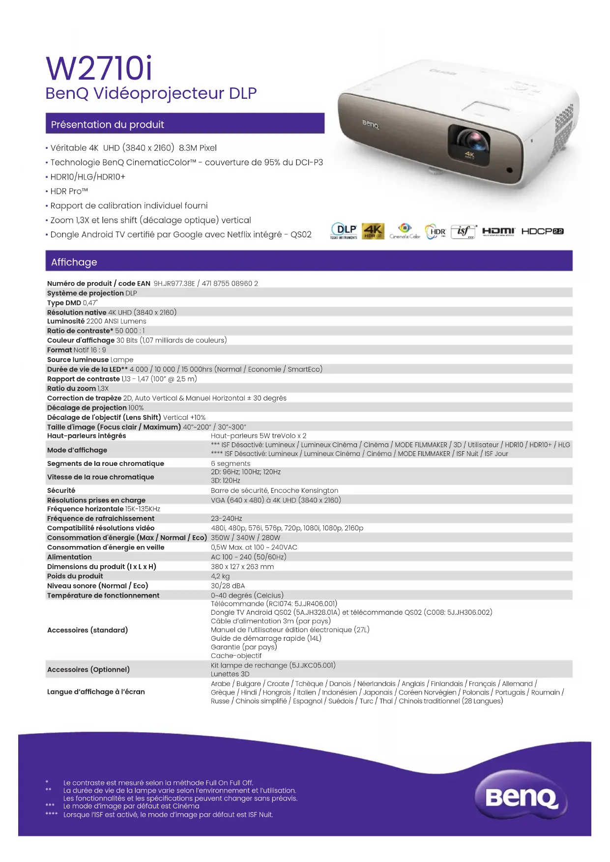 - Dongle Android TV certié par Google avec Netix intégré - QS02 W2710i BenQ Vidéoprojecteur DLP Afchage Numéro de produit / code EAN 9H.JR977.38E / 471 8755 08960 2 Système de projection DLP Type DMD 0,47" Résolution native 4K UHD (3840 x 2160) Luminosité 2200 ANSI Lumens Ratio de contraste* 50 000 : 1 Couleur d'afchage 30 Bits (1,07 milliards de couleurs) Format Natif 16 : 9 Source lumineuse Lampe Durée de vie de la LED** 4 000 / 10 000 / 15 000hrs (Normal / Economie / SmartEco) Rapport de contraste 1,13 - 1,47 (100” @ 2,5 m) Ratio du zoom 1,3X Correction de trapèze 2D, Auto Vertical & Manuel Horizontal ± 30 degrés Décalage de projection 100% Décalage de l'objectif (Lens Shift) Vertical +10% Taille d'image (Focus clair / Maximum) 40”~200” / 30”~300” Haut-parleurs intégrés Haut-parleurs 5W treVolo x 2 Mode d’afchage *** ISF Désactivé: Lumineux / Lumineux Cinéma / Cinéma / MODE FILMMAKER / 3D / Utilisateur / HDR10 / HDR10+ / HLG **** ISF Désactivé: Lumineux / Lumineux Cinéma / Cinéma / MODE FILMMAKER / ISF Nuit / ISF Jour Segments de la roue chromatique 6 segments Vitesse de la roue chromatique 2D: 96Hz; 100Hz; 120Hz 3D: 120Hz Sécurité Barre de sécurité, Encoche Kensington Résolutions prises en charge VGA (640 x 480) à 4K UHD (3840 x 2160) Fréquence horizontale 15K-135KHz Fréquence de rafraichissement 23-240Hz Compatibilité résolutions vidéo 480i, 480p, 576i, 576p, 720p, 1080i, 1080p, 2160p Consommation d'énergie (Max / Normal / Eco) 350W / 340W / 280W Consommation d'énergie en veille 0,5W Max. at 100 ~ 240VAC Alimentation AC 100 ~ 240 (50/60Hz) Dimensions du produit (l x L x H) 380 x 127 x 263 mm Poids du produit 4,2 kg Niveau sonore (Normal / Eco) 30/28 dBA Température de fonctionnement 0~40 degrés (Celcius) Accessoires (standard) Télécommande (RCI074: 5J.JR406.001) Dongle TV Android QS02 (5A.JH328.01A) et télécommande QS02 (C008: 5J.JH306.002) Câble d’alimentation 3m (par pays) Manuel de l’utilisateur édition électronique (27L) Guide de démarrage rapide (14L) Garantie (par pays) Cache-objectif Accessoires (Optionnel) Kit lampe de rechange (5J.JKC05.001) Lunettes 3D Langue d’afchage à l’écran Arabe / Bulgare / Croate / Tchèque / Danois / Néerlandais / Anglais / Finlandais / Français / Allemand / Grèque / Hindi / Hongrois / Italien / Indonésien / Japonais / Coréen Norvégien / Polonais / Portugais / Roumain / Russe / Chinois simplié / Espagnol / Suédois / Turc / Thaï / Chinois traditionnel (28 Langues) Présentation du produit