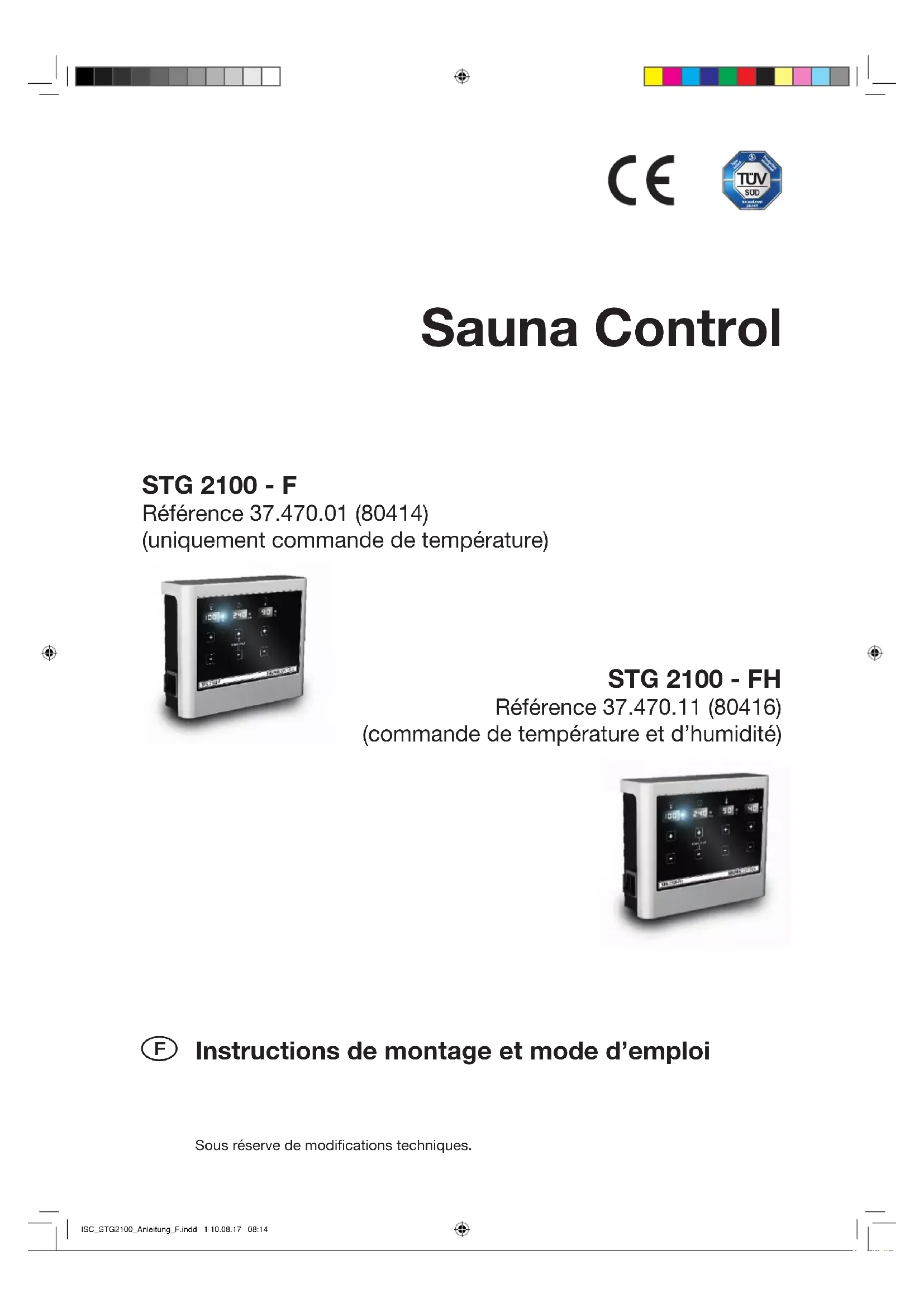 Commande de sauna Les appareils de commande STG 2100 – F et STG 2100 – FH font partie intégrante d’une cabine de sauna fonctionnant correctement dès lors que toutes les conditions requises sont remplies de façon appropriée. Un appareil de commande en combinaison avec un poêle de sauna approprié ne peut fonctionner de manière optimale que si les raccords électriques du distributeur principal à l’appareil de commande et de l’appareil de commande au poêle de sauna sont réalisés correctement et par un spécialiste conformément aux schémas de raccordement et aux prescriptions avec le matériel prévu à cet effet. Les dérangements de l’appareil de commande peuvent également résulter d’une amenée d’air insuffisante ou d’une ventilation insuffisante du poêle de sauna ainsi que d’ouvertures d’évacuation de l’air trop petites ou manquantes suite à un fonctionnement continu. Veuillez pour ce faire tenir compte de notre « Fiche d’information » jointe. En cas de réglage de température et d’humidité, il peut y avoir des différences entre la température et l’humidité réglées et affichées. Cela s’explique par le fait que la plupart des appareils d’affichage mécaniques sont montés sur la paroi intérieure du sauna. La paroi du sauna présente cependant toujours des températures inférieures à la température ambiante réelle dans la cabine. Les indicateurs d’humidité peuvent aussi afficher des valeurs incorrectes lors du redémarrage tant que la cabine n’a pas été chauffée à une température suffisante.
