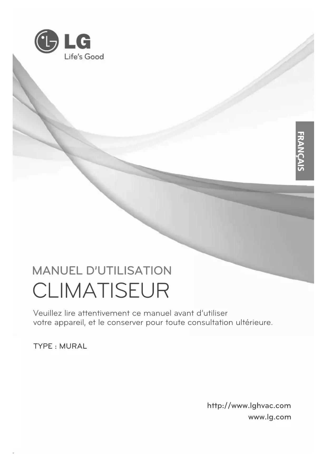 CLIMATISEUR Veuillez lire attentivement ce manuel avant d’utiliser votre appareil, et le conserver pour toute consultation ultérieure. TYPE : MURAL www.lg.com http://www.lghvac.com FRANÇAIS2 Climatiseur de pièce Manuel dʼutilisation du climatiseur de pièce Table des Matières A CONSERVER Inscrivez les numéros de modèle et de série ci-dessous : Numéro de Modèle Numéro de Série Vous trouverez ces renseignements sur lʼétiquette située sur le côté de chaque unité. Nom de distributeur Date dʼachat n Agrafez votre ticket de caisse à cette page dans le cas ou vous devriez prouver la date dʼachat, ou pour tout problème de garantie.
