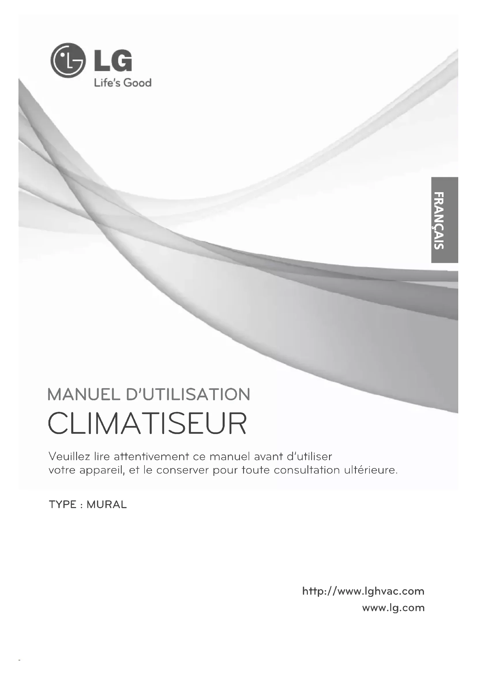 CLIMATISEUR Veuillez lire attentivement ce manuel avant d’utiliser votre appareil, et le conserver pour toute consultation ultérieure. TYPE : MURAL www.lg.com http://www.lghvac.com FRANÇAIS2 Climatiseur de pièce Manuel dʼutilisation du climatiseur de pièce Table des Matières A CONSERVER Inscrivez les numéros de modèle et de série ci-dessous : Numéro de Modèle Numéro de Série Vous trouverez ces renseignements sur lʼétiquette située sur le côté de chaque unité. Nom de distributeur Date dʼachat n Agrafez votre ticket de caisse à cette page dans le cas ou vous devriez prouver la date dʼachat, ou pour tout problème de garantie.