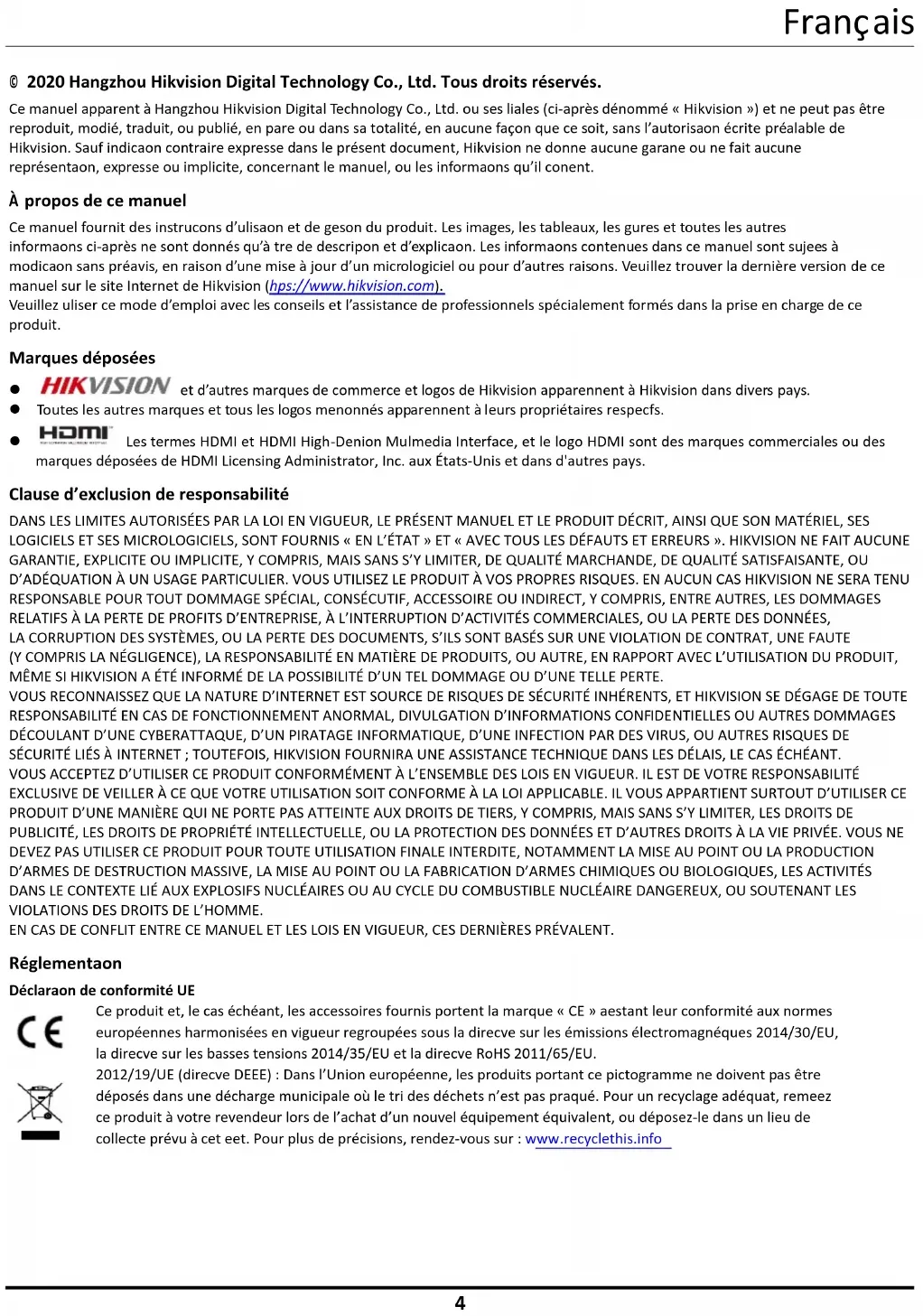 © 2020 Hangzhou Hikvision Digital Technology Co., Ltd. Tous droits réservés. Ce manuel appartient à Hangzhou Hikvision Digital Technology Co., Ltd. ou ses filiales (ci-après dénommé « Hikvision ») et ne peut pas être reproduit, modifié, traduit, ou publié, en partie ou dans sa totalité, en aucune façon que ce soit, sans l’autorisation écrite préalable de Hikvision. Sauf indication contraire expresse dans le présent document, Hikvision ne donne aucune garantie ou ne fait aucune représentation, expresse ou implicite, concernant le manuel, ou les informations qu’il contient. À propos de ce manuel Ce manuel fournit des instructions d’utilisation et de gestion du produit. Les images, les tableaux, les figures et toutes les autres informations ci-après ne sont donnés qu’à titre de description et d’explication. Les informations contenues dans ce manuel sont sujettes à modification sans préavis, en raison d’une mise à jour d’un micrologiciel ou pour d’autres raisons. Veuillez trouver la dernière version de ce manuel sur le site Internet de Hikvision (https://www .hikvision.com). Veuillez utiliser ce mode d’emploi avec les conseils et l’assistance de professionnels spécialement formés dans la prise en charge de ce produit. Marques déposées et d’autres marques de commerce et logos de Hikvision appartiennent à Hikvision dans divers pays. Toutes les autres marques et tous les logos mentionnés appartiennent à leurs propriétaires respectifs. Les termes HDMI et HDMI High-Definition Multimedia Interface, et le logo HDMI sont des marques commerciales ou des marques déposées de HDMI Licensing Administrator, Inc. aux États-Unis et dans d'autres pays. Clause d’exclusion de responsabilité DANS LES LIMITES AUTORISÉES PAR LA LOI EN VIGUEUR, LE PRÉSENT MANUEL ET LE PRODUIT DÉCRIT, AINSI QUE SON MATÉRIEL, SES LOGICIELS ET SES MICROLOGICIELS, SONT FOURNIS « EN L’ÉTAT » ET « AVEC TOUS LES DÉFAUTS ET ERREURS ». HIKVISION NE FAIT AUCUNE GARANTIE, EXPLICITE OU IMPLICITE, Y COMPRIS, MAIS SANS S’Y LIMITER, DE QUALITÉ MARCHANDE, DE QUALITÉ SATISFAISANTE, OU D’ADÉQUATION À UN USAGE PARTICULIER. VOUS UTILISEZ LE PRODUIT À VOS PROPRES RISQUES. EN AUCUN CAS HIKVISION NE SERA TENU RESPONSABLE POUR TOUT DOMMAGE SPÉCIAL, CONSÉCUTIF, ACCESSOIRE OU INDIRECT, Y COMPRIS, ENTRE AUTRES, LES DOMMAGES RELATIFS À LA PERTE DE PROFITS D’ENTREPRISE, À L’INTERRUPTION D’ACTIVITÉS COMMERCIALES, OU LA PERTE DES DONNÉES, LA CORRUPTION DES SYSTÈMES, OU LA PERTE DES DOCUMENTS, S’ILS SONT BASÉS SUR UNE VIOLATION DE CONTRAT, UNE FAUTE (Y COMPRIS LA NÉGLIGENCE), LA RESPONSABILITÉ EN MATIÈRE DE PRODUITS, OU AUTRE, EN RAPPORT AVEC L’UTILISATION DU PRODUIT, MÊME SI HIKVISION A ÉTÉ INFORMÉ DE LA POSSIBILITÉ D’UN TEL DOMMAGE OU D’UNE TELLE PERTE. VOUS RECONNAISSEZ QUE LA NATURE D’INTERNET EST SOURCE DE RISQUES DE SÉCURITÉ INHÉRENTS, ET HIKVISION SE DÉGAGE DE TOUTE RESPONSABILITÉ EN CAS DE FONCTIONNEMENT ANORMAL, DIVULGATION D’INFORMATIONS CONFIDENTIELLES OU AUTRES DOMMAGES DÉCOULANT D’UNE CYBERATTAQUE, D’UN PIRATAGE INFORMATIQUE, D’UNE INFECTION PAR DES VIRUS, OU AUTRES RISQUES DE SÉCURITÉ LIÉS À INTERNET ; TOUTEFOIS, HIKVISION FOURNIRA UNE ASSISTANCE TECHNIQUE DANS LES DÉLAIS, LE CAS ÉCHÉANT. VOUS ACCEPTEZ D’UTILISER CE PRODUIT CONFORMÉMENT À L’ENSEMBLE DES LOIS EN VIGUEUR. IL EST DE VOTRE RESPONSABILITÉ EXCLUSIVE DE VEILLER À CE QUE VOTRE UTILISATION SOIT CONFORME À LA LOI APPLICABLE. IL VOUS APPARTIENT SURTOUT D’UTILISER CE PRODUIT D’UNE MANIÈRE QUI NE PORTE PAS ATTEINTE AUX DROITS DE TIERS, Y COMPRIS, MAIS SANS S’Y LIMITER, LES DROITS DE PUBLICITÉ, LES DROITS DE PROPRIÉTÉ INTELLECTUELLE, OU LA PROTECTION DES DONNÉES ET D’AUTRES DROITS À LA VIE PRIVÉE. VOUS NE DEVEZ PAS UTILISER CE PRODUIT POUR TOUTE UTILISATION FINALE INTERDITE, NOTAMMENT LA MISE AU POINT OU LA PRODUCTION D’ARMES DE DESTRUCTION MASSIVE, LA MISE AU POINT OU LA FABRICATION D’ARMES CHIMIQUES OU BIOLOGIQUES, LES ACTIVITÉS DANS LE CONTEXTE LIÉ AUX EXPLOSIFS NUCLÉAIRES OU AU CYCLE DU COMBUSTIBLE NUCLÉAIRE DANGEREUX, OU SOUTENANT LES VIOLATIONS DES DROITS DE L’HOMME. EN CAS DE CONFLIT ENTRE CE MANUEL ET LES LOIS EN VIGUEUR, CES DERNIÈRES PRÉVALENT. Réglementation Déclaration de conformité UE